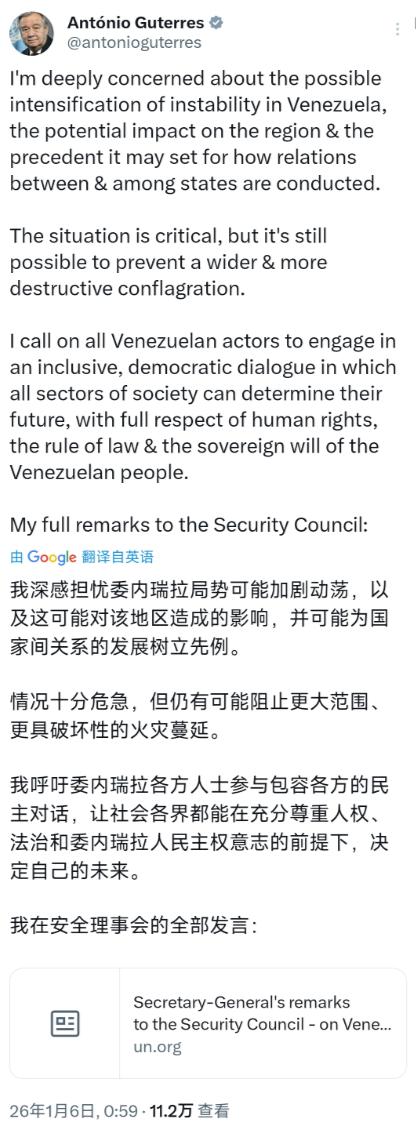 联合国深感无力!1月6日,联合国秘书长古特雷斯发文:“我深感担忧委内瑞拉局势可能加剧动荡,以及这可能对该地区造成的影响,并可能为国家间关系的发展树立先例。情况十分危急,但仍有可能阻止更大范围,更具破坏性的火灾蔓延。我呼吁委内瑞拉各方人士参与包容各方的民主对话,让社会各界都能在充分尊重人权,法治和委内瑞拉人民主权意志的前提下,决定自己的未来。” 说白了,联合国这次的表现堪称畏首畏尾的“隔岸观火”,所谓的作用,不过是不痛不痒的几句呼吁。 要知道,美国是在没有联合国授权的情况下,公然对委内瑞拉进行袭击的,并将其总统及总统夫人押出国境,是明显的侵权行为,而联合国居然没有公然谴责美国,只表达了对委瑞内拉的担忧,虽然联合国没有自己的预备军,但是有权利组织各方势力组成预备军对美国的行为进行严厉批评与警告,甚至发起行动,然而联合国却并没有这么做。 说实话,联合国这样的表态只会让各方势力更加寒心,难以信服,如果联合国只能拿出这般软绵绵的呼吁,连一句谴责的话都不敢说,连一点约束力的举措都不愿做,那它真的会让人怀疑有没有存在的必要了。 说到底,国际社会需要的是一个有担当、敢作为的联合国,希望联合国能成为弱小国家的靠山,而现实却是,它正一步步沦为强权的附庸,而这只会让联合国越来越没有公信力,最终被架空为一个徒有虚名的“清谈馆”,彻底丧失维护国际公平正义的价值。