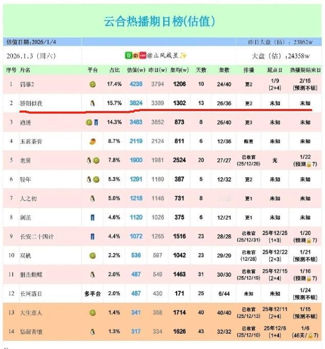 《骄阳似我》离大谱了! 虽然明白这部剧是鹅厂现偶重点大剧,顾漫五部曲收官之作,不容有失,但是1300万集均热度破30000万也是离了大普,其他剧热度破30000万,至少云合占比30%,日播放量6000-7000万,但是《骄阳似我》云合占比只有16%,日播放量不到3900万,差的不是一星半点.