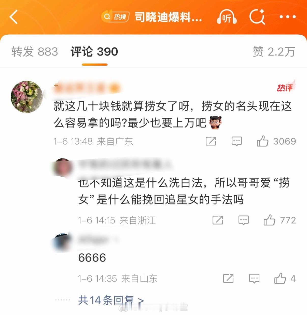 用户39xxx60 1 2026-01-08 15:44 低端的捞女,手法太低端所以没有一个男的珍惜,也捞不到,所以过不好了恼羞成怒出来爆料了,说白了就是为了流量,为了能爆红赚点红利,可怜激起的水花太小太小了