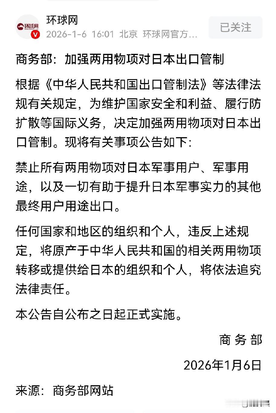 国家终于出手了!对日本军用稀土出口管制!这一下,将严厉打击日本右翼的嚣张气焰。 表明中国政府对日本军国主义绝不纵容。日本右翼分子心心念念的恢复军国主义的荣光,将彻底落空!我们对中国政府的政策表示完全支持。但我们也严格区分日本右翼和日本人民,对民用的稀土,我们没有禁止。 时隔近两个月,高市早苗涉台谬论仍然没有撤回。中方的反制措施有理有据。站在道义制高点,日本政府的反对,没有任何理由。这是高市早苗政府求锤得锤,怪不得别人! 台湾民进党赖清德当局“倚日谋独”也将破产,祖国统一大势,势不可挡,我们不是说说而已! 稀土出口限制 中方稀土战略 稀土出口禁令 稀土出口新规 日本稀土禁运日本右翼 日本军国主义 高市早苗