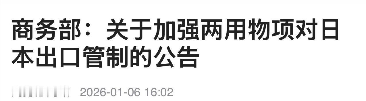 商务部出手!这次实实在在打到日本的“七寸”上。 不是部分,也不是特定!是所有原产于中华人民共和国的两用物项都禁止卖给小日子。 商务部这次的出手,没有含糊,没有留情。所有原产于中国的两用物项,全面禁止卖给日本。这记重拳,实实在在打在了日本的“七寸”上。 很多中老年朋友可能会问,啥是两用物项?简单说,这类物品就是既能民用,又能直接用到军事上的“跨界选手”。国务院发布的《中华人民共和国两用物项出口管制条例》里早就明确了定义,它们涵盖的范围极广,小到精密电子元件,大到特种材料,细究下来足足有上千个品类。 别觉得这些物项离我们远,它们藏在生活和军事的方方面面。比如手机里的高端芯片,民用能实现通讯功能,军用就能装在无人机上做导航核心;再比如稀土永磁材料,民用可造新能源汽车电机,军用就是导弹制导系统和战斗机发动机的关键部件。中国的禁令,就是从源头切断日本军事扩张的物资命脉。 日本的军事发展,早就离不开中国的两用物项了。一组实打实的数据能说清这个依赖度有多深。日本军工生产所需的稀土永磁材料,90%都要从中国进口。 这种材料是制造高精度武器的基础,没有它,日本想造的先进无人机、远程导弹都得成“无头苍蝇”。还有半导体制造用的超高纯度氟化氢,70%来自中国江西的企业,这种化学品民用可用于芯片蚀刻,军用就是制造精密电子战装备的核心原料。 日本近期的动作更能说明问题。它2026财年的国防预算飙到9万亿日元,创下连续12年的新高。其中专门拨出1000亿日元,要采购数千架军用无人机,还和英国、意大利合作开发隐形“战斗支援无人机”。这些无人机的机身材料、导航芯片,都离不开中国管制的两用物项。冲绳的第15旅团要升级为师团,新增反舰导弹单元和高速滑翔弹,这些装备的生产,同样缺不了中国的特种金属合金和精密仪器。 之前台湾地区的案例,更能印证这种管制的杀伤力。商务部曾将台军无人机、导弹研制的主力实体列入管制名单,禁止向其出口两用物项。 这些实体之前频繁爆出使用大陆配件的丑闻,台军“锐鸢2”无人机用了大陆的通讯模组,“雄风3”导弹的校验设备竟是从山东青岛维修后运回的,就连导弹的固体燃料都来自大陆。 管制实施后,这些实体的无人机生产线停滞,导弹研发进度大幅滞后。日本现在面临的处境,比当时的台湾地区还要严峻,因为它面对的是全面禁令,而非针对特定实体。 有人可能会想,日本会不会找其他国家替代采购?这个想法太不切实际。搭建新的供应链,至少需要18到24个月的时间。 而且中国在很多两用物项领域占据全球主导地位,2023年中国大陆生产了全球98%的镓,这种材料是先进雷达的核心部件,日本根本绕不开。更关键的是,替代采购的成本会暴涨30%以上,日本本土技术还跟不上,就比如精炼稀土,日本的能耗是中国的4倍,纯度还达不到军工要求。 商务部的禁令还有一道“护身符”。任何国家、地区或个人,只要违反规定转口中国两用物项给日本,都会受到法律追责。这就彻底堵死了日本想通过新加坡、越南等第三方“曲线采购”的路子。中国的态度很明确,绝不允许任何势力利用中国的物资,危害中国的国家安全。 这不是一次普通的贸易管制,而是对日本军事扩张的精准遏制。日本近些年不断突破和平宪法限制,大幅增加国防预算,强化军事部署,其野心昭然若揭。商务部的禁令,正好掐住了它军事发展的“命门”。没有中国的两用物项,日本的军事扩张计划就是空中楼阁。 我们始终坚持和平发展,但绝不允许别人拿着我们的东西,反过来威胁我们的安全。这次商务部的出手,彰显了中国维护国家安全和地区和平的坚定决心。这记重拳打在日本的“七寸”上,打得准,打得狠,也让全世界看到,中国有能力、有手段,守护好自己的核心利益。