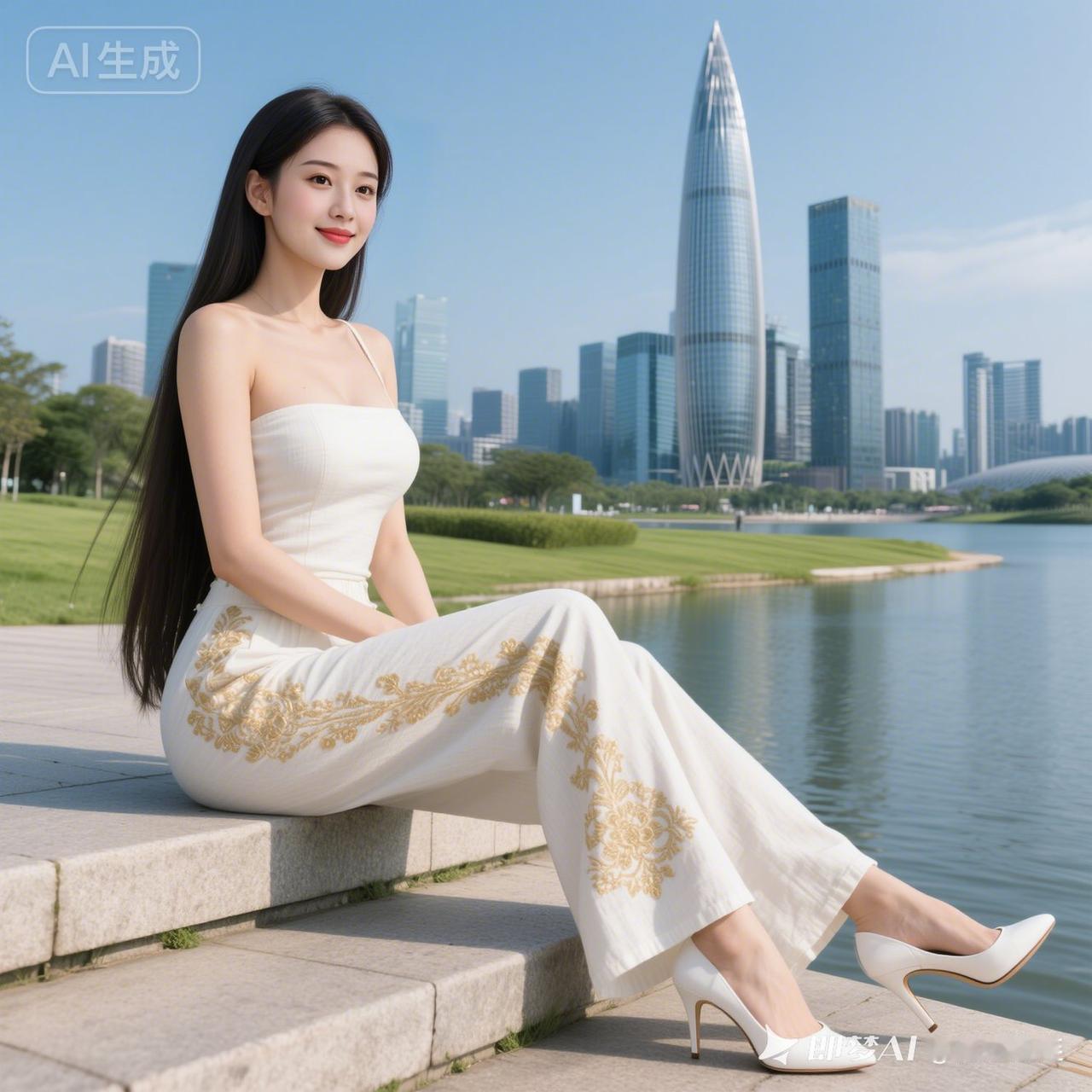 都市丽人风范,优雅坐于湖畔,时尚与自然完美融合。