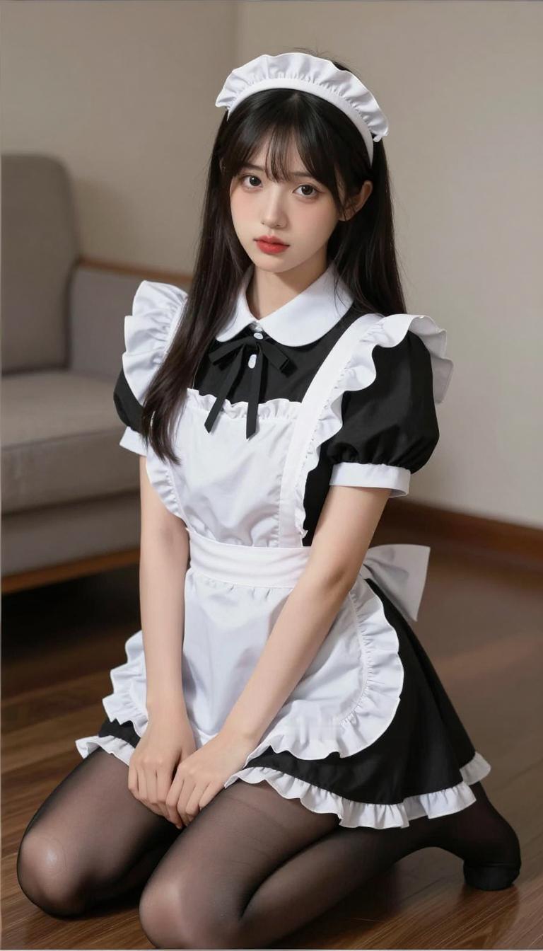 2.温柔的女仆装扮搭配乌黑长发,荷叶边围裙与黑丝相映,跪坐的姿态尽显娇柔,氛围感直接拉满