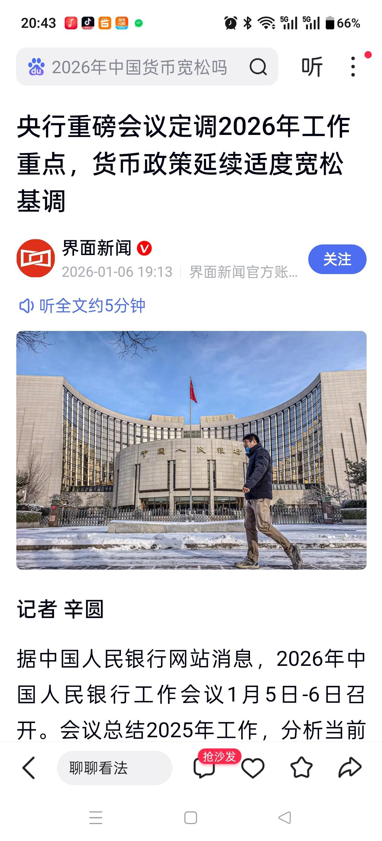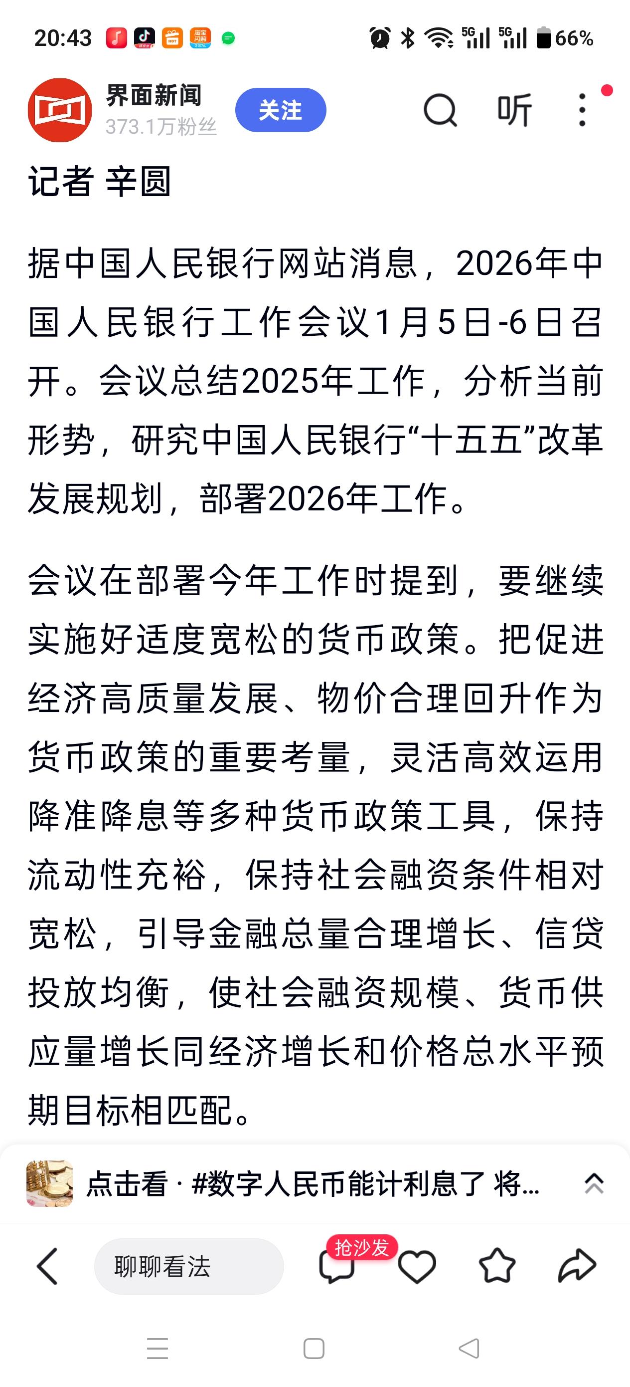 快来看!劲爆了! 今天晚上最大的消息就是,央行宣布:2026年将继续实施适度宽松的货币政策,灵活高效运用降准降息等多种货币政策工具。 我的天!明天又得中大阳了,难怪今天证券都动了!明天证券一个大阳线,指数就得60点起步了! 干! 不过各位,别上头,冲的厉害了,记得落袋为安啊!落袋子里的钱才是你的钱,不然都是虚妄!