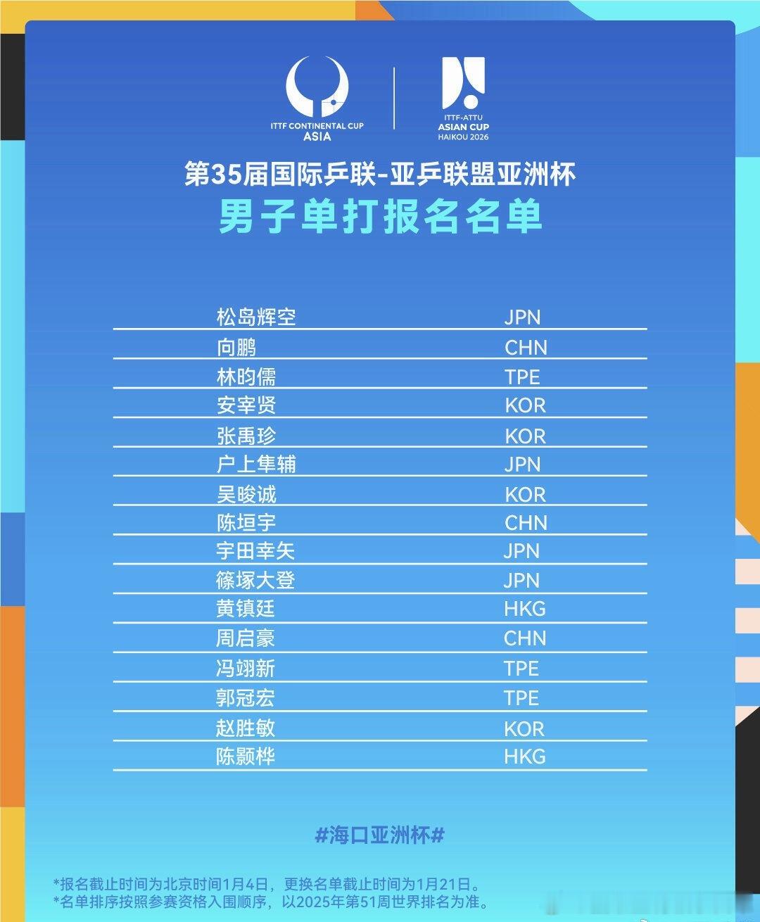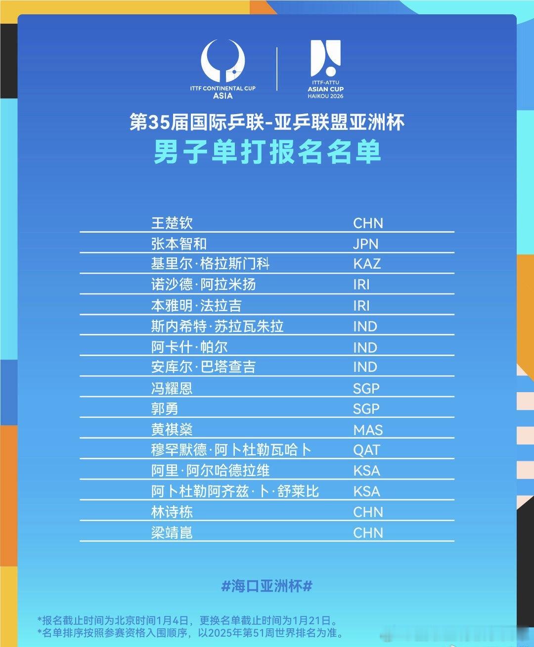 海口亚洲杯国乒阵容海口亚洲杯国乒12人参赛赛事名称:第35届国际乒联-亚乒联盟亚洲杯2026 - 海口站赛事时间:2026年2月4日-8日赛事场馆:海南海口・秀英区海口五源河体育馆(自贸港封关后首场大型国际体育盛会举办地)赛事亮点:汇聚亚洲各国顶尖选手巅峰对决,国乒12人豪华阵容出征(王楚钦、王曼昱携卫冕资格直通,孙颖莎、林诗栋等名将悉数参赛)