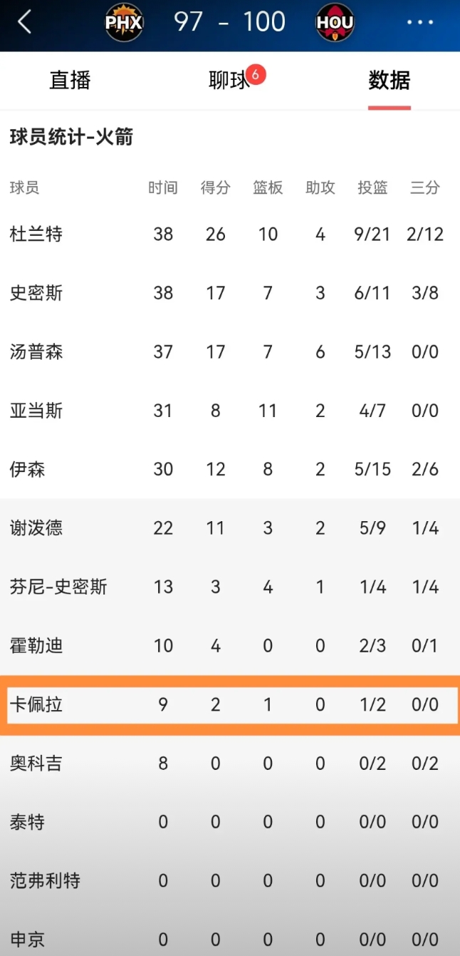 我强烈建议火箭中锋卡佩拉增加自己的出手次数!在今天火箭主场以100:97击败太阳的比赛中,卡佩拉仅仅出手了2次,导致他在进攻端毫无存在感。