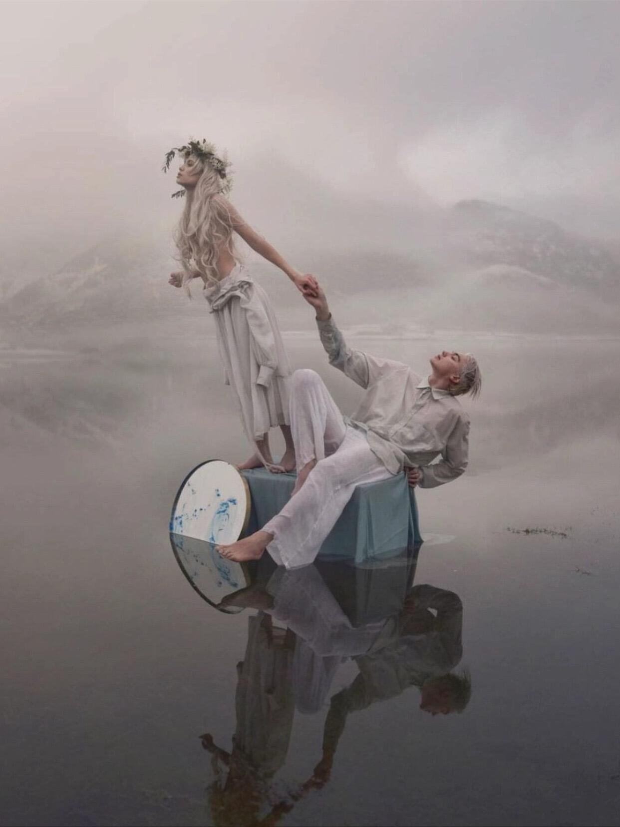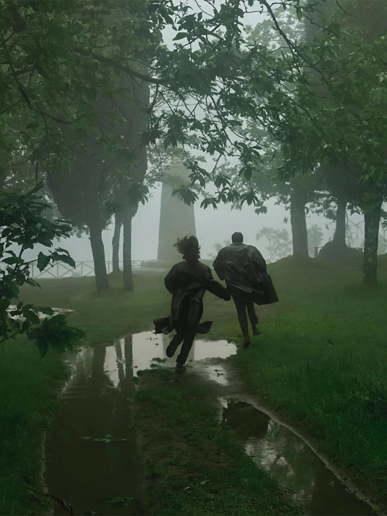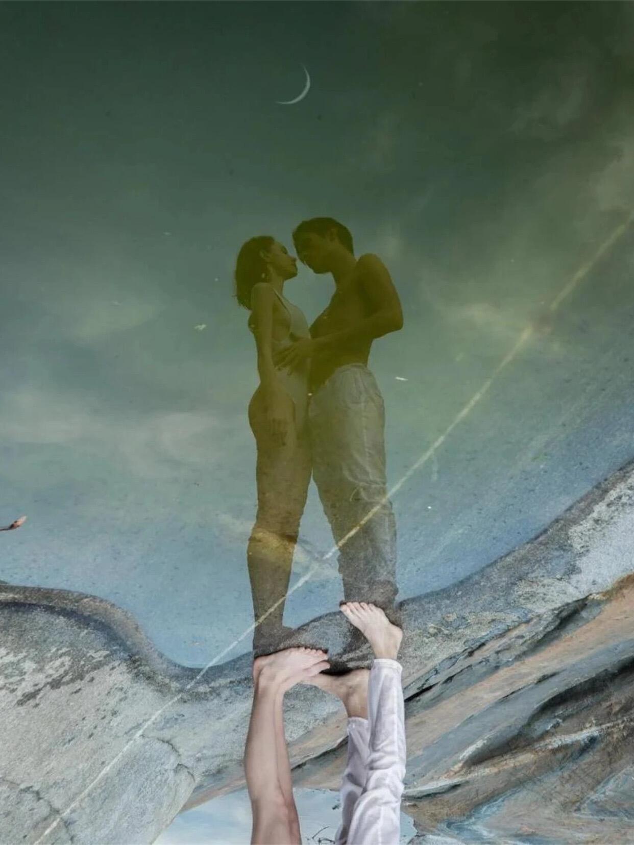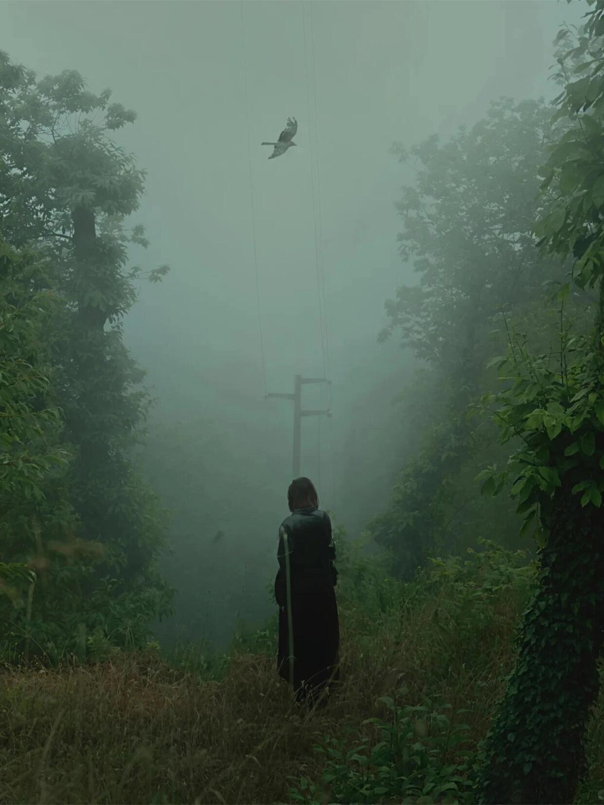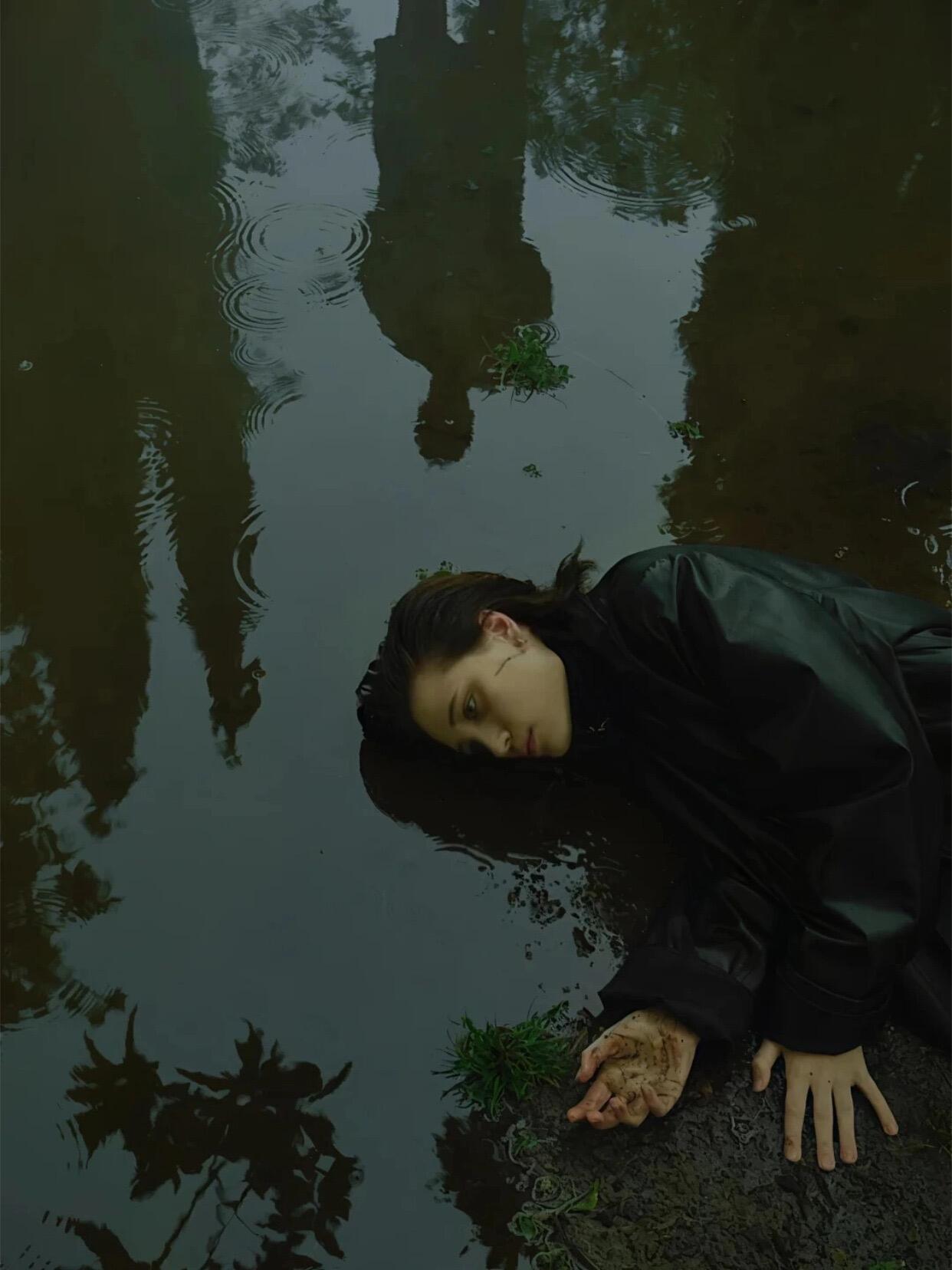 这组作品以水雾、暗调为基底构建视觉体系,首幅水面俯拍画面将人物与水的交融作为情绪载体,人物侧脸贴靠水面的姿态弱化了肢体的张力,转而以眉眼的松弛感传递出沉浸与迷茫交织的情绪。水面的波纹与人物湿润的发丝形成视觉呼应,冷调的青绿色调统一了画面质感,让环境与人物的情绪达成视觉上的共生。 构图上采用非对称式布局,人物偏居画面右侧,左侧留白的水面延伸出想象空间,倒影的虚化处理则模糊了现实与虚幻的边界,契合意识流的表达内核。但画面中人物手部的泥土细节稍显突兀,若做弱化处理,能让视觉焦点更集中于面部的情绪表达,进一步强化水雾氛围的朦胧感与情绪的纯粹性。
