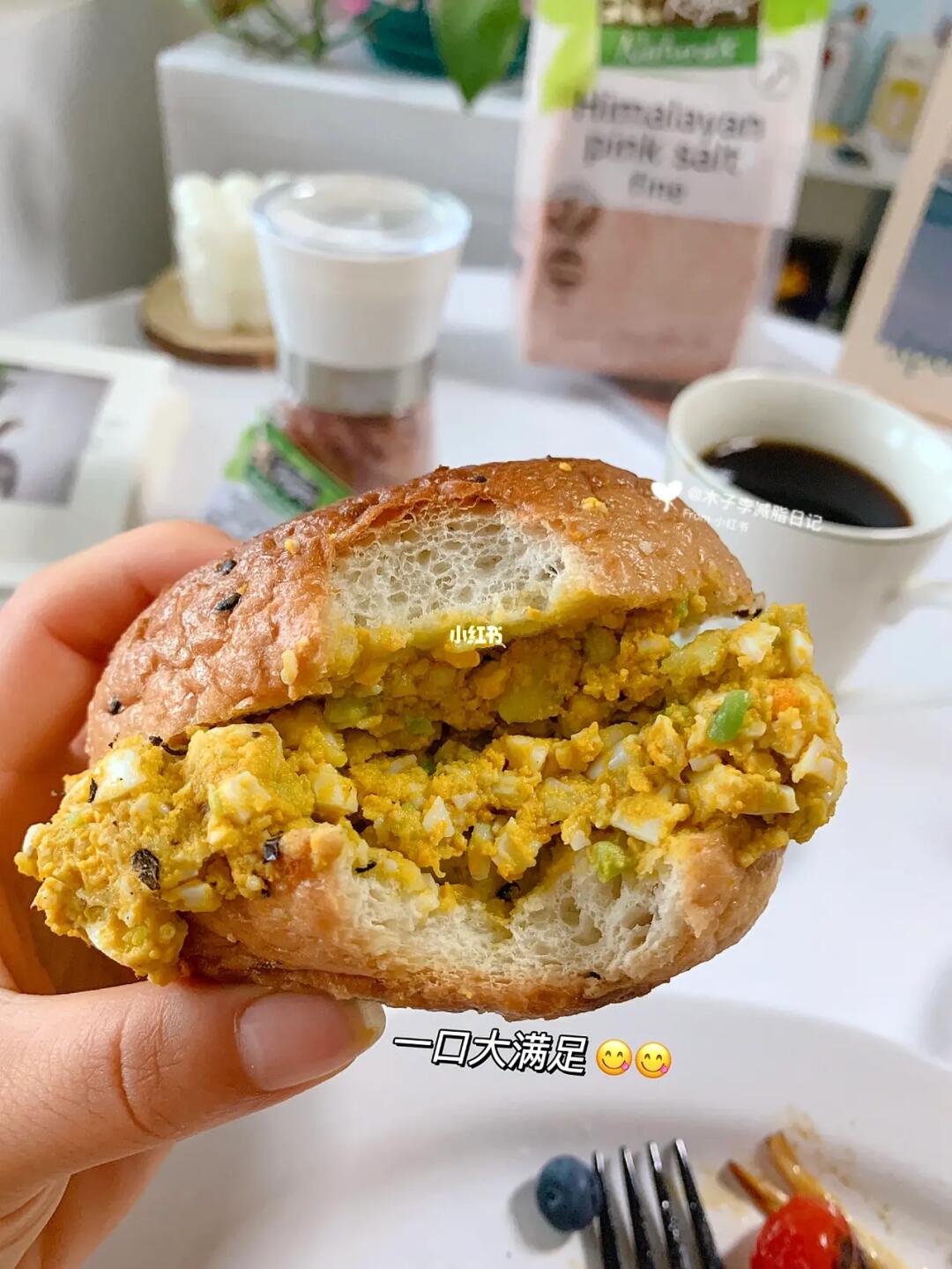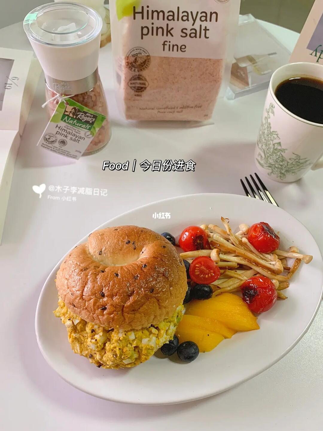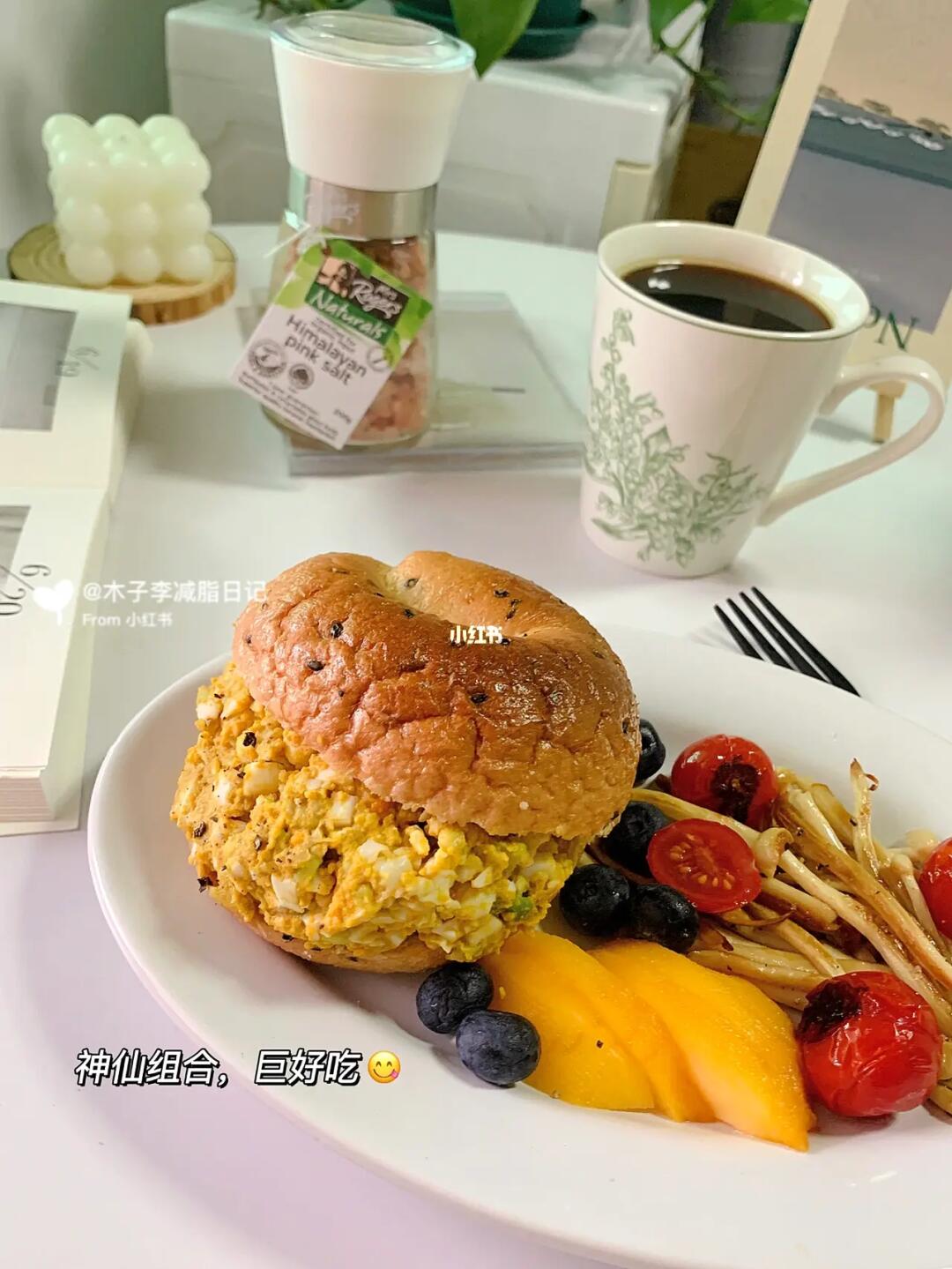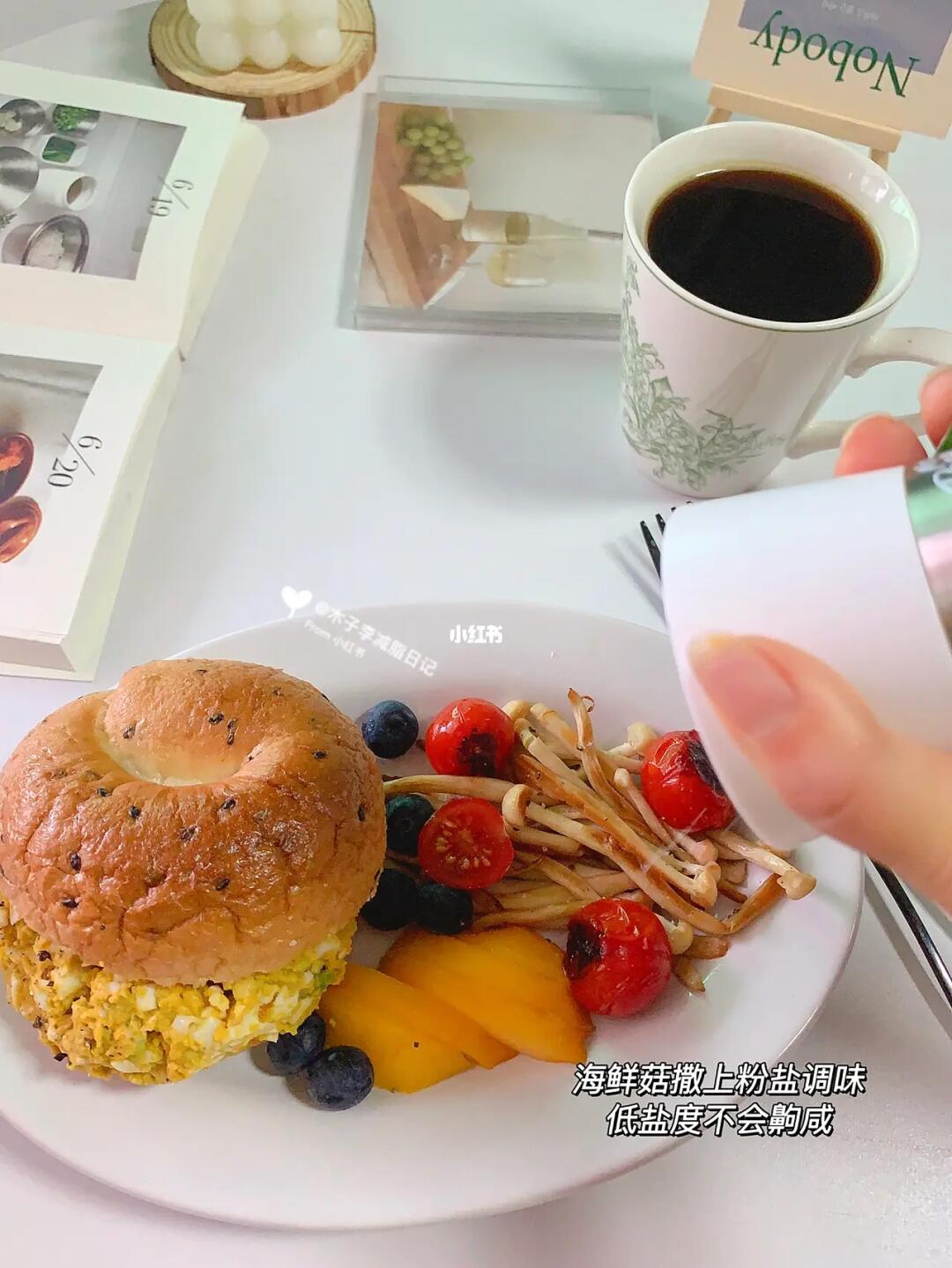 准备1个牛油果🥑和2个水煮蛋🥚捣碎再加入黑胡椒,粉盐,低脂蛋黄酱调味~把贝果塞满满当当的巨满足!