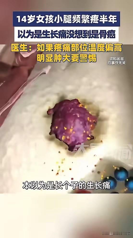 “悲剧还是发生了!”河南郑州,一女孩小腿频繁疼痛,家长以为是生长痛,没当回事,没想到半年也没减轻,甚至影响了睡眠和正常走路,直到发现女孩小腿变粗,家长才带去医院检查,结果发现竟是骨癌!医生:恶性肿瘤,占据小腿三分之二! 河南郑州一场本该避免的悲剧,让无数家长揪心不已。一名女孩频繁喊小腿疼,家长想当然当成了孩子生长发育中的正常现象,没放在心上。 可这疼痛足足持续了半年,不仅没减轻反而越来越严重,直到发现女孩小腿明显变粗,才慌忙带去医院检查,结果如晴天霹雳——孩子患上了骨癌,恶性肿瘤已经占据了小腿三分之二的部位。 女孩正处在生长发育的关键阶段,半年前开始时不时说自己小腿疼。起初只是偶尔发作,大多在运动后或晚上睡觉前, 家长想着这个年纪的孩子常出现生长痛,是骨骼快速生长带来的正常反应,便没太在意,只是简单安慰几句,让孩子多休息、补充点营养。 可随着时间推移,情况并没有好转。疼痛从间歇性变成了持续性,尤其是到了夜间,疼得越来越厉害,常常让女孩半夜醒来,翻来覆去难以入睡。 原本活泼好动的她,渐渐变得不爱走路,上下楼梯都需要人搀扶,就连平时喜欢的户外活动也只能远远看着,稍微活动一下,小腿就疼得直冒汗。 家长看着孩子难受的样子,心里虽有担心,却依旧没往严重的方向想,只是觉得可能是生长痛比别的孩子明显些,或是不小心运动拉伤了肌肉。 他们尝试过用热敷、按摩的方式帮孩子缓解,可效果微乎其微,疼痛还是一天比一天加剧。 直到有一次给孩子换裤子时,家长才赫然发现,女孩疼痛的那条小腿,竟然比另一条粗了一圈,用手摸上去还有硬硬的肿块,按压时孩子疼得直咧嘴。 这个明显的变化让家长瞬间慌了神,再也不敢拖延,第二天一早就带着孩子赶往医院检查。 一系列检查下来,医生的诊断结果让家长彻底崩溃——女孩患上的是骨恶性肿瘤,也就是大家常说的骨癌。 通过影像学检查可以清晰看到,肿瘤已经在小腿骨骼内疯狂生长,占据了小腿三分之二的范围,骨骼结构遭到了严重破坏。 医生介绍,骨癌在青少年群体中并不罕见,10-20岁正是高发年龄段,而早期症状往往就是局部疼痛,这也导致很多家长容易将其与生长痛混淆,从而延误最佳治疗时机。 生长痛大多是间歇性的,休息后就能缓解,且不会出现局部肿胀、肿块等症状;但骨癌引起的疼痛会进行性加重,夜间疼痛尤为明显,还可能伴随肢体肿胀、活动受限等情况,这些都是重要的区分信号。 据了解,骨癌如果能早期发现并及时进行规范治疗,部分患者可以最大限度保留肢体功能,提高生存率。 但女孩的病情因为延误了半年,已经错过了最佳治疗窗口,后续需要进行化疗、手术等一系列综合治疗,不仅治疗过程痛苦,预后也不容乐观。 家长得知这一情况后,悔恨交加,不停自责当初没有重视孩子的疼痛,要是能早点带孩子来检查,或许就不会是现在这个结果。看着病床上强忍疼痛的孩子,他们心如刀割,却只能强打精神陪伴孩子面对后续的治疗。 这个令人痛心的案例,也给所有家长敲响了警钟。儿童和青少年的身体变化需要时刻关注,尤其是出现不明原因的疼痛、肿胀、活动异常等情况时,千万不能凭经验主观判断,更不能拖延。 生长痛虽常见,但并非所有肢体疼痛都是生长痛,及时就医检查,才能排除恶性疾病的可能,为孩子的健康保驾护航。 临床数据显示,青少年骨肿瘤的误诊率不低,很多都被误认为是生长痛或运动损伤,等到症状明显时病情已经发展到中晚期。 这就需要家长多了解相关健康知识,同时保持警惕,一旦孩子身体出现异常信号,第一时间寻求专业医疗帮助,才能避免类似的悲剧重演。 对此,你们有什么看法,欢迎评论留言~