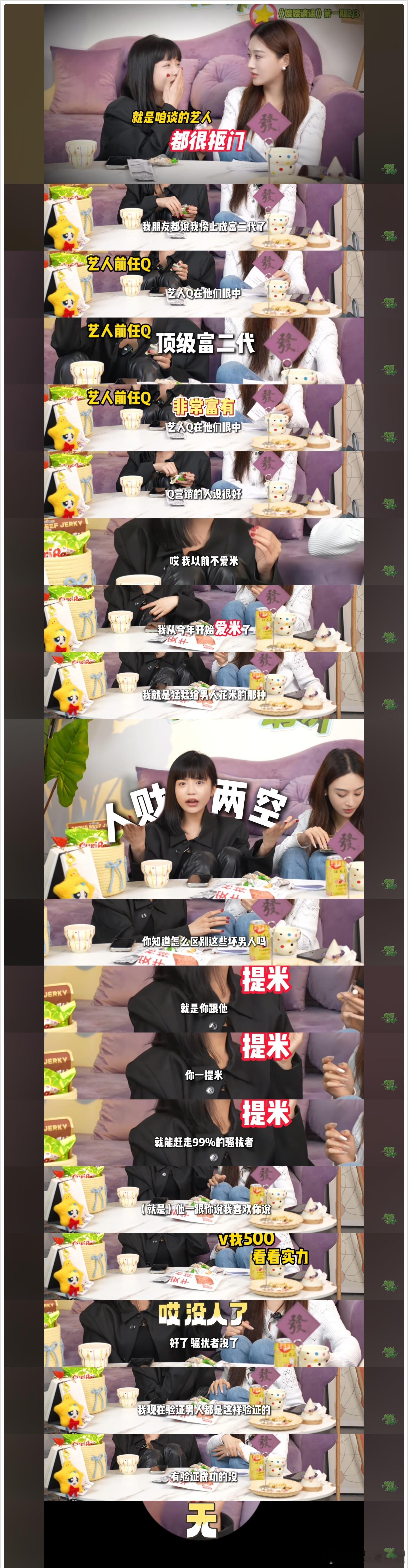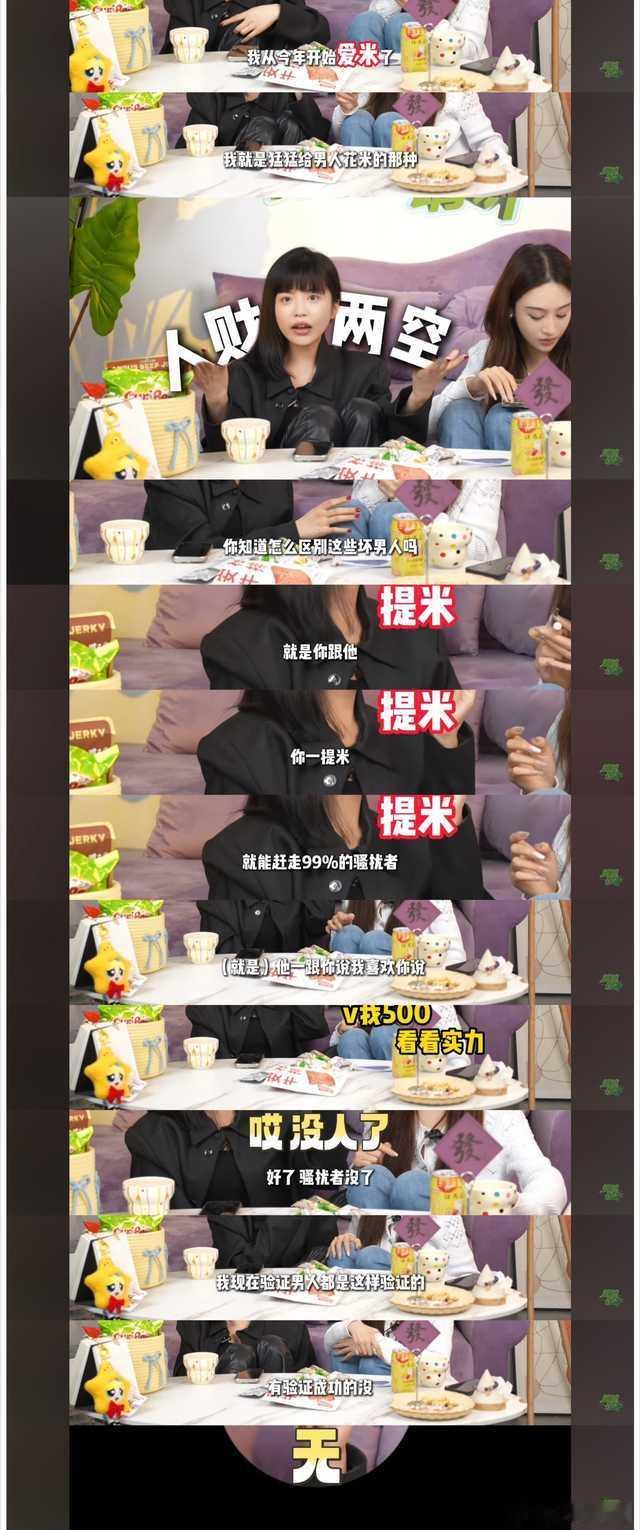 司晓迪去年参加辛雨锡的《嫂嫂请讲》说谈的艺人都抠门。有男艺人有顶级富二代人设,但是就是人设,相处也是她花米。追求她的男生给她花了一千五,分开后她就会给三千对方。她一般都是给对方花双倍或者更多的人。“我就是猛猛给男人花米的那种”司晓迪说判断验证一个人是不是坏男人,就是提米。