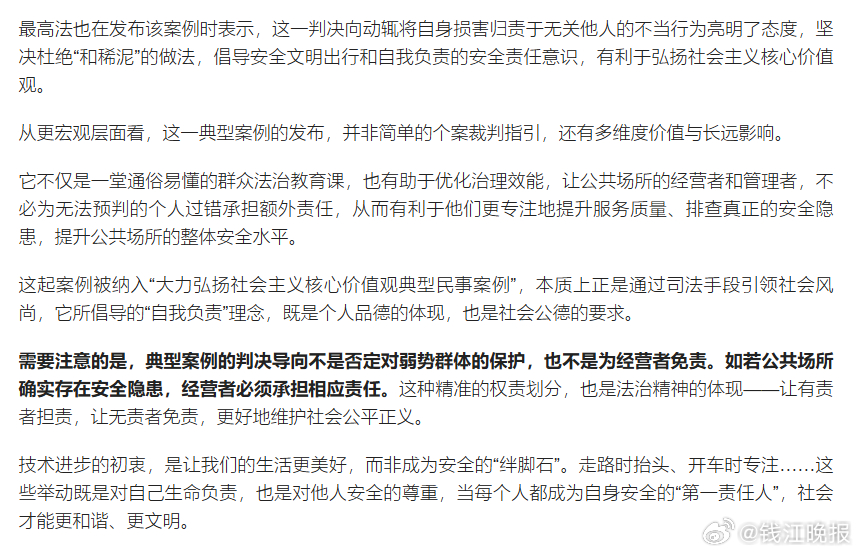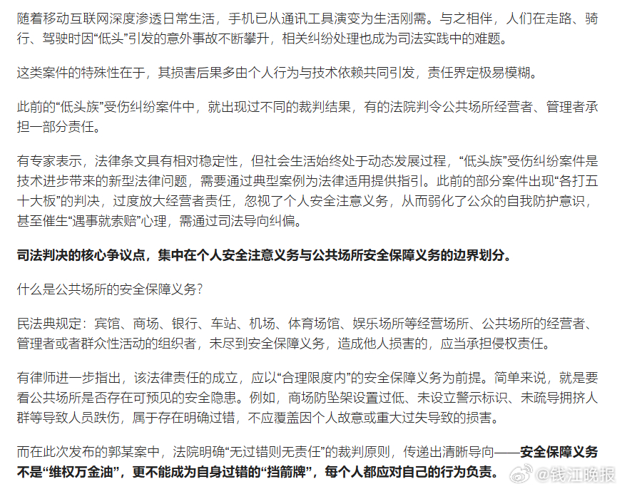 【#低头看手机踩空摔伤餐厅被判无责#】低头看手机踩空摔伤,公共场所经营者、管理者要不要担责?近日,最高人民法院发布第四批人民法院大力弘扬社会主义核心价值观典型民事案例。其中一起健康权纠纷案,备受社会关注。2024年1月,郭某在上海浦东某餐厅用餐结束后步行离开,在餐厅外的台阶区域不慎踩空摔倒。事发10天后,郭某自行到医院就诊,被诊断为腰椎右侧横突骨折。郭某认为餐厅经营者某餐饮公司和餐厅所在楼宇的物业管理企业某商业管理公司没有尽到安全保障义务,对磨损的台阶也没有及时修复,导致其摔倒受伤,起诉要求赔偿医疗费、误工费等6万余元。但餐厅外的监控视频显示,从出现在画面中开始,郭某一直在低头看手机。监控画面中未见下雨、下雪,台阶处也未见积雪、积水、冰冻。最高人民法院对此通报:郭某就餐完毕后离开餐厅,经营者和管理者对郭某在行走时低头看手机的行为不能预判也无法控制。郭某是完全民事行为能力人,摔倒是其自身未尽安全注意义务所致,某餐饮公司和某商业管理公司并无过错,不应承担赔偿责任,故判决驳回郭某全部诉讼请求。这一案例被最高法纳入典型案例库,引发社会关注和热议,关键点在于它戳中了当下的社会痛点——“低头族”的人身安全边界与事故责任归属。(潮新闻 记者 钱祎)