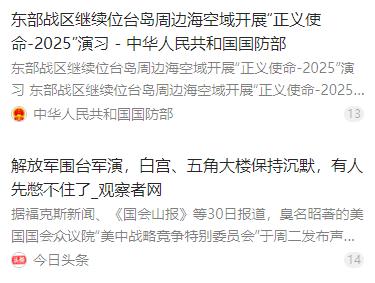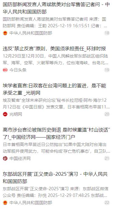 这下终于看清楚了,在国家统一的道路上,谁才是我们的绊脚石!军演第二天,也就是12月30日,美国众议院“中国问题特别委员会声称:解放军在台岛周边演习“是蓄意升级”、“破坏了地区局势的和平稳定”。   麻烦看官老爷们右上角点击一下“关注”,既方便您进行讨论和分享,又能给您带来不一样的参与感,感谢您的支持!   2025 年 12 月 30 日,解放军 “正义使命 - 2025” 台岛周边军演进入第二天,一场针对 “台独” 分裂势力和外部干涉的正义行动,却引来一群不速之客的指手画脚。美国众议院 “美中战略竞争特别委员会” 率先跳出来,倒打一耙指责演习 “蓄意升级局势”“破坏地区和平稳定”,这番颠倒黑白的言论,让谁在阻碍中国统一的真相暴露无遗。   紧随美国之后,欧盟及英、法、德、日等国纷纷跟风表态。欧盟对外行动署声称 “反对单方面改变现状”,德国外交部指责军演 “破坏稳定”,法国呼吁 “保持克制”,英国则强调 “不支持武力改变现状”。这些国家明明承认一个中国原则,却无视台海紧张的真正根源,实质是在干涉中国内政。   更值得警惕的是日本的动作。首相高市早苗此前公然抛出 “台湾有事构成日本存亡危机事态” 的谬论,暗示要武力介入台海。军演期间,日本外务省又向中方表达 “关切”,还提升战机警戒等级,其插手台海事务的野心昭然若揭。就连菲律宾的 “驻台代表” 也跟着呼吁 “克制”,全然忘了台湾是中国领土的事实。   其实,解放军这场军演完全是被逼出来的。12 月 18 日,美国批准了总额高达 111 亿美元的对台军售,创下历史之最,出售的包括 “海马斯” 远程火箭炮等进攻性武器,严重违反中美三个联合公报。这种赤裸裸的武装 “台独” 行为,无疑是在台海局势的火药桶上点火。   面对外部势力的挑衅,民进党当局不仅不反对,反而感恩戴德,还妄图 “倚外谋独”“以武拒统”。赖清德当局不断增加防务预算,推动 “全民皆兵”,甚至提出 1.25 万亿新台币的防务特别预算,却被国民党和民众党联手封杀。岛内越来越多民众看清,民进党是把台湾推向战争边缘的祸根。   12 月 29 日,东部战区正式启动 “正义使命 - 2025” 演习,陆军、海军、空军、火箭军多兵种协同作战。台岛周边多个海域,驱护舰开展对海突击、防空反潜演练,轰 - 6K 战机编队远程奔袭模拟打击,陆军远箱火分队实弹射击,两栖攻击舰编队开展立体投送演练,全方位检验联合作战能力。   这场演习的目标十分明确,就是针对 “台独” 分裂势力和外部干涉势力。国防部新闻发言人早已明确表态,“台独” 同台海和平水火不容,外部势力纵容 “台独” 只会引火烧身。军演是捍卫国家主权和领土完整的必要行动,也是对各类挑衅行为的有力反制。   美方的表态充满矛盾。总统特朗普声称 “不担心台海局势”,五角大楼则 “无可奉告”,但国会却跳出来炒作 “中国威胁”。这种分裂态度恰恰说明,美国只是把台湾当成遏制中国的棋子,根本不在乎台湾民众的安危,所谓 “支持台湾” 不过是牟取利益的谎言。   事实上,美国长期以来一直在台海问题上搞双重标准。《八一七公报》中明明承诺逐步减少并最终停止对台军售,却一次次食言,不断突破军售规模和武器性能底线。此次 111 亿美元的军售,就是对承诺的公然背弃,也是破坏台海和平的罪魁祸首。   中方早已采取反制措施。针对美国对台军售,外交部宣布制裁 20 家美国军工企业和 10 名高管,冻结其在华资产,禁止商业往来。这一系列精准打击,让美国军火商付出了实际代价,也彰显了中方捍卫核心利益的决心。   岛内的有识之士也纷纷发声反对 “台独”。不少台湾民众走上街头抗议民进党当局的 “谋独” 行径,认为 “倚外谋独” 只会让台湾陷入灾难。就连台防务部门智库研究员也承认,解放军军演是在 “对外部干涉释放强烈信号”。   历史和现实都证明,外部干涉势力是中国统一的最大绊脚石。从过去到现在,总有国家想利用台湾问题牵制中国发展,阻碍中华民族复兴。但他们打错了算盘,中国人民维护国家统一的意志坚如磐石,任何势力都无法阻挡。   解放军的实力早已今非昔比。此次军演中,多军兵种联合行动,远程精确打击能力、海空协同封控能力得到充分检验。这充分说明,我们有坚定的意志、充分的信心和足够的能力,挫败任何 “台独” 分裂图谋和外部干涉行为。   那些指责中国的国家,恰恰是破坏地区稳定的始作俑者。美国在全球到处挑起冲突,日本不断突破和平宪法、扩充军备,欧盟一些国家跟风干涉他国内政。他们没有资格对中国的正义行动说三道四,更无权插手中国的内政。   台湾问题纯属中国内政,解决台湾问题是中国人自己的事。任何外部势力都没有权利指手画脚,任何分裂国家的行径都必将遭到失败。这是国际社会的普遍共识,也是不可阻挡的历史潮流。