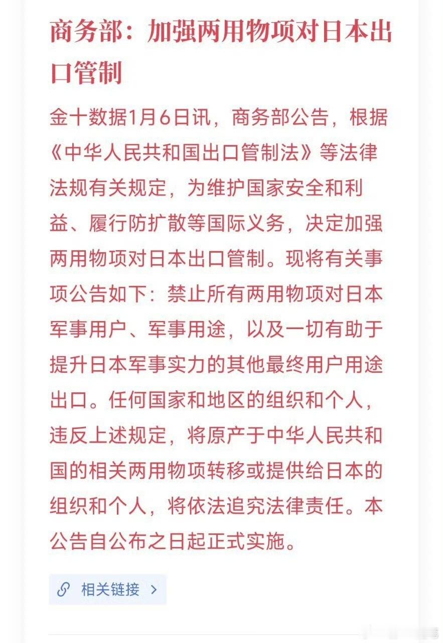 商务部:加强两用物项对日本出口管制!禁止所有两用物项对日本军事用户、军事用途,以及一切有助于提升日本军事实力的其他最终用户用途出口。日本继续跳,收拾他们有的是办法,现在中国是全球产业链主链条,日本就是不知道好歹。中国开始要立威了,全球产业链主链的威力,日本人吃不了兜着走。