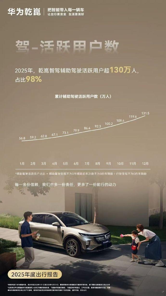 华为乾崑2025答卷太炸了!130万活跃用户98%都爱用智驾,一年开54.2亿公里绕地球13.5万圈,实力说话~安全直接拉满!累计避撞379万次,平均每位车主少遇1.6次危险,CAS 4.0防碰撞系统超安心~ 座舱更贴心,智慧助手唤醒26亿次,无缝流转超1.3亿次,智能又好开,2026新车型狠狠期待住!!华为乾崑年度答卷