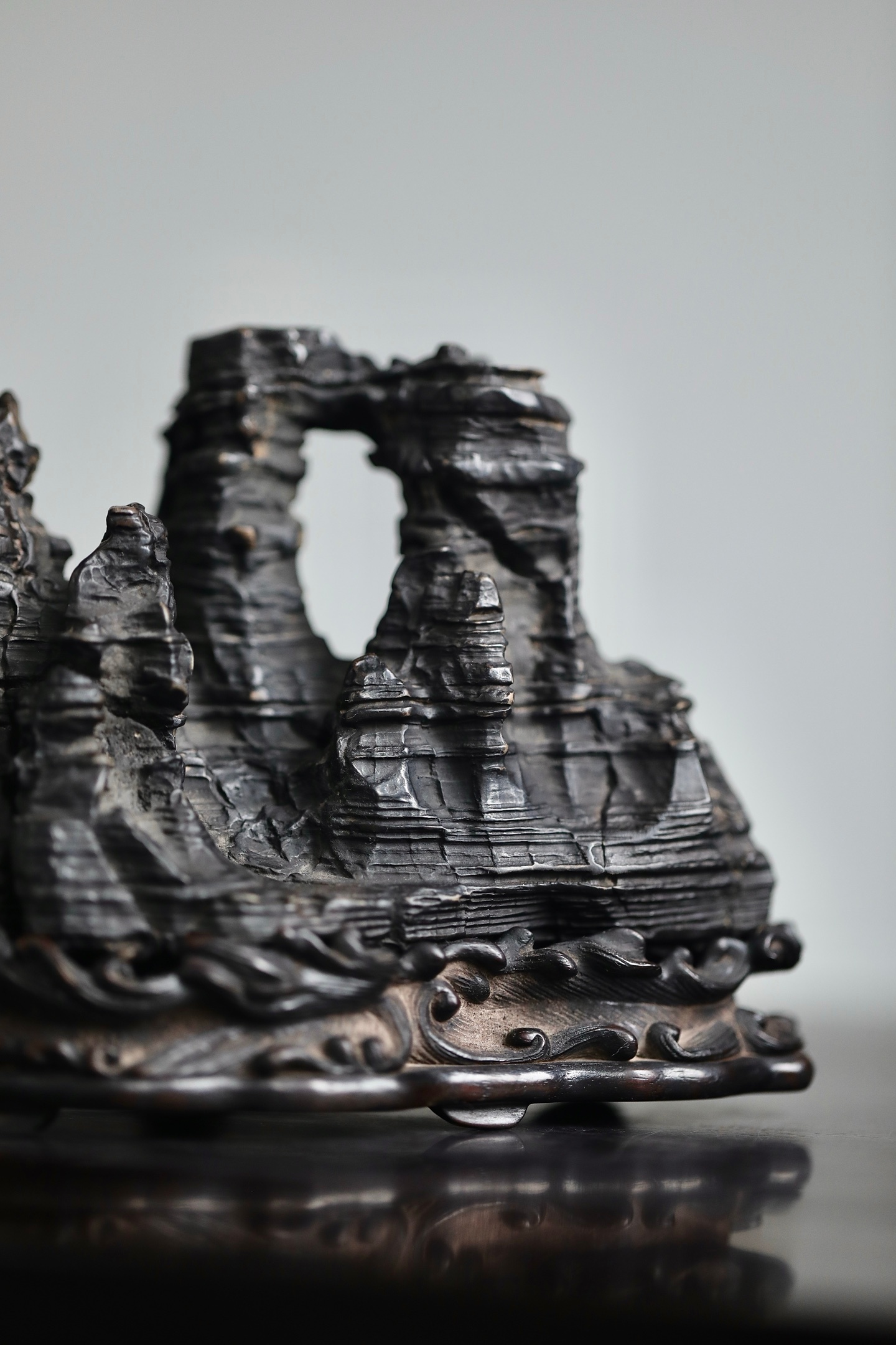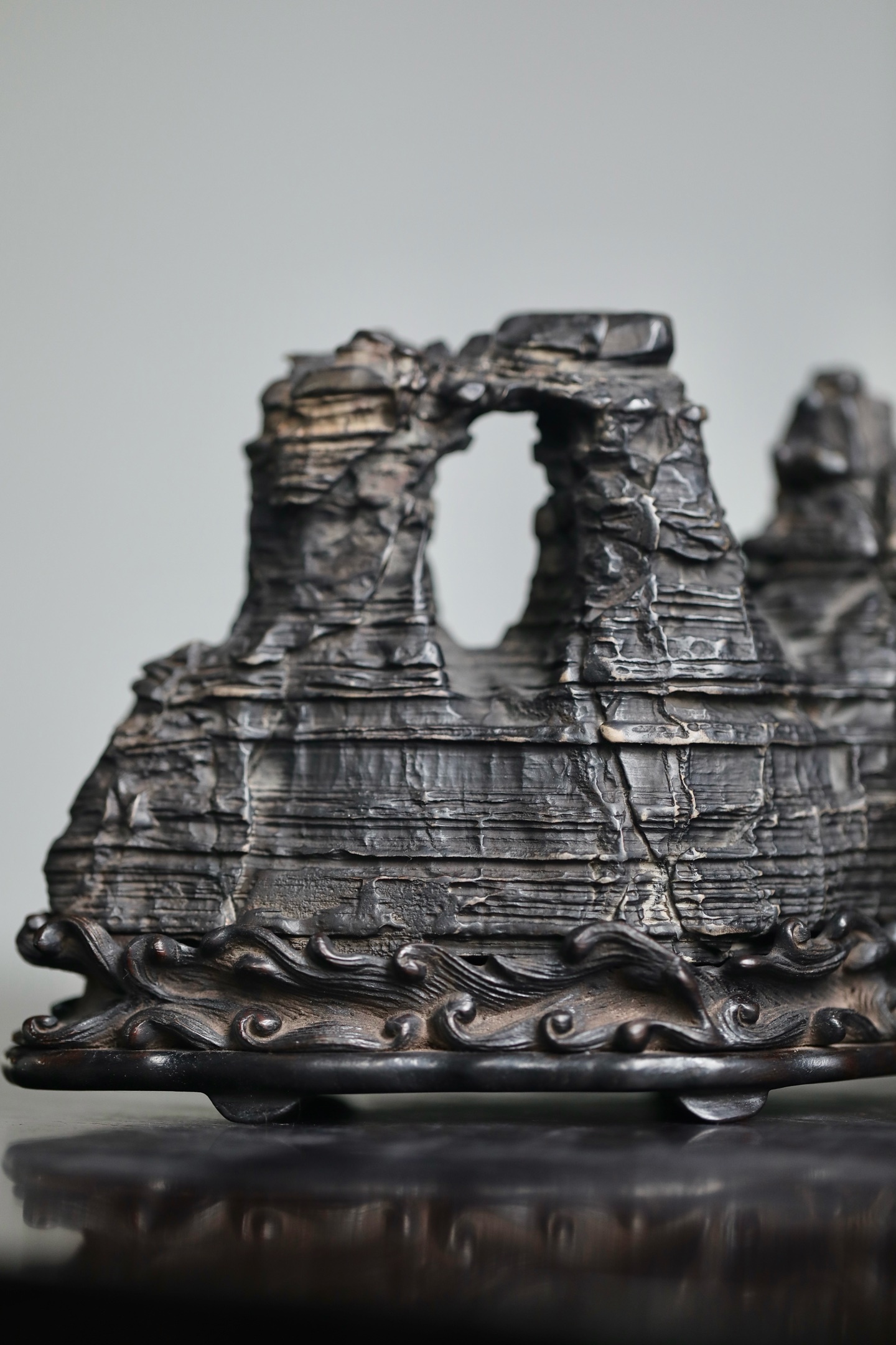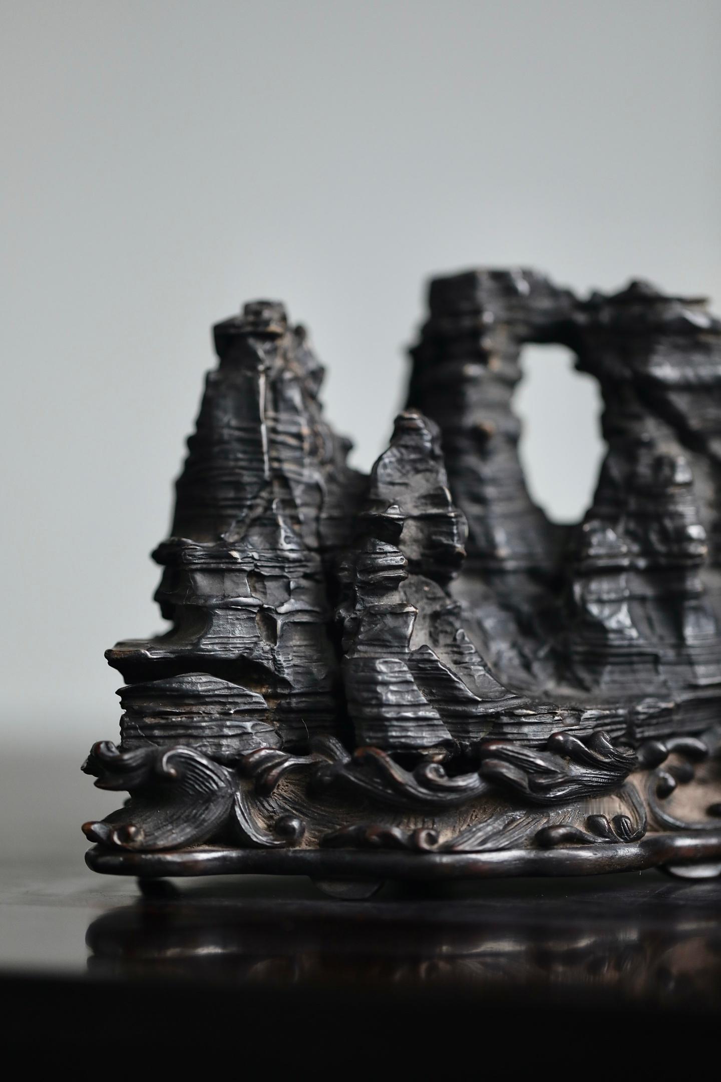灵璧石 | 山子这方灵璧石山子,纹理如被风雨侵蚀过的层层岩崖,每一道褶皱都饱经沧桑。它的形态不是一味的奇崛,而是在苍古中透着稳重。主峰挺拔,次峰相依,那处天然的孔洞,更像是岁月在山体上留下的印记,虚实之间,自有一番深沉的古韵。24×9.6×13cm