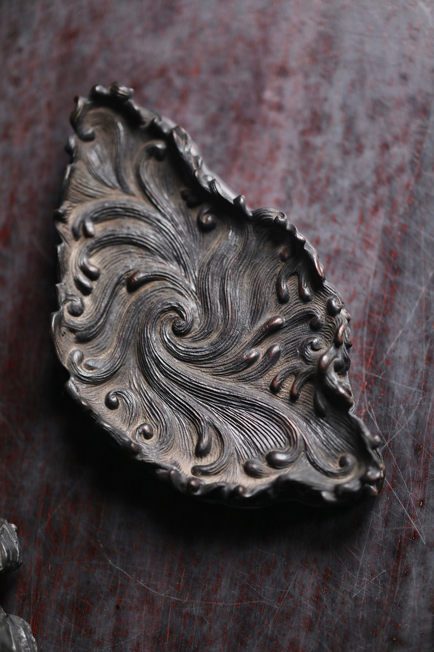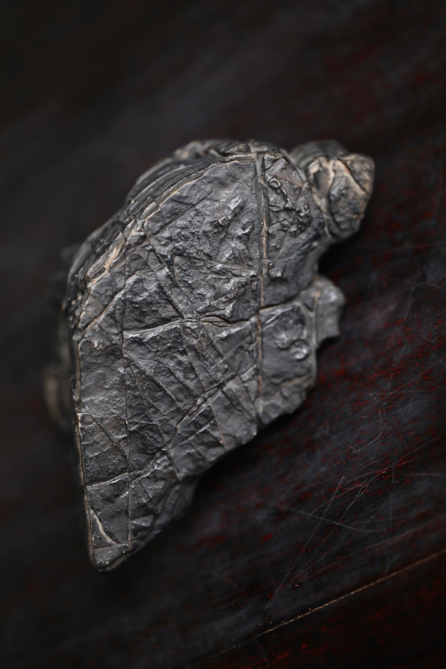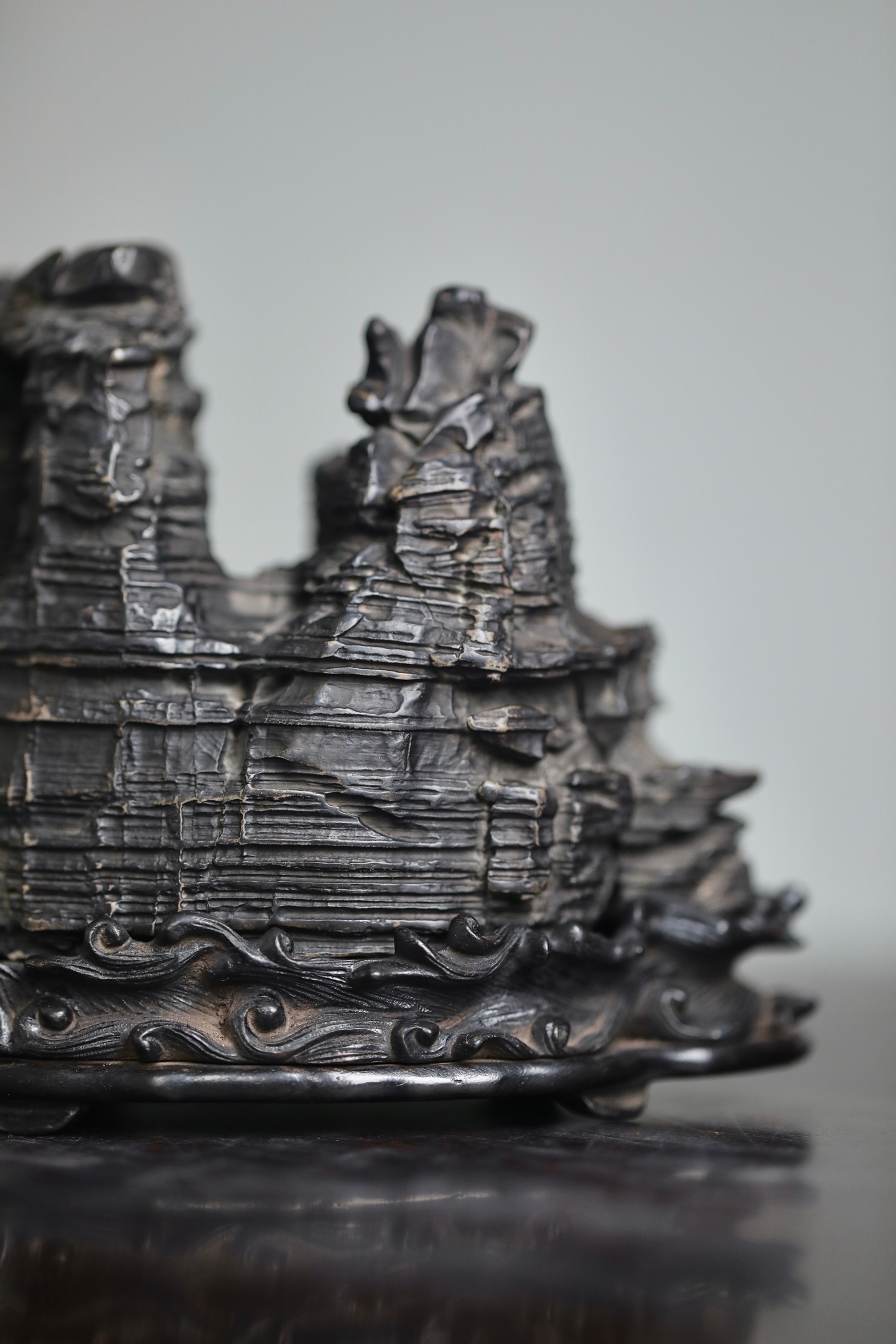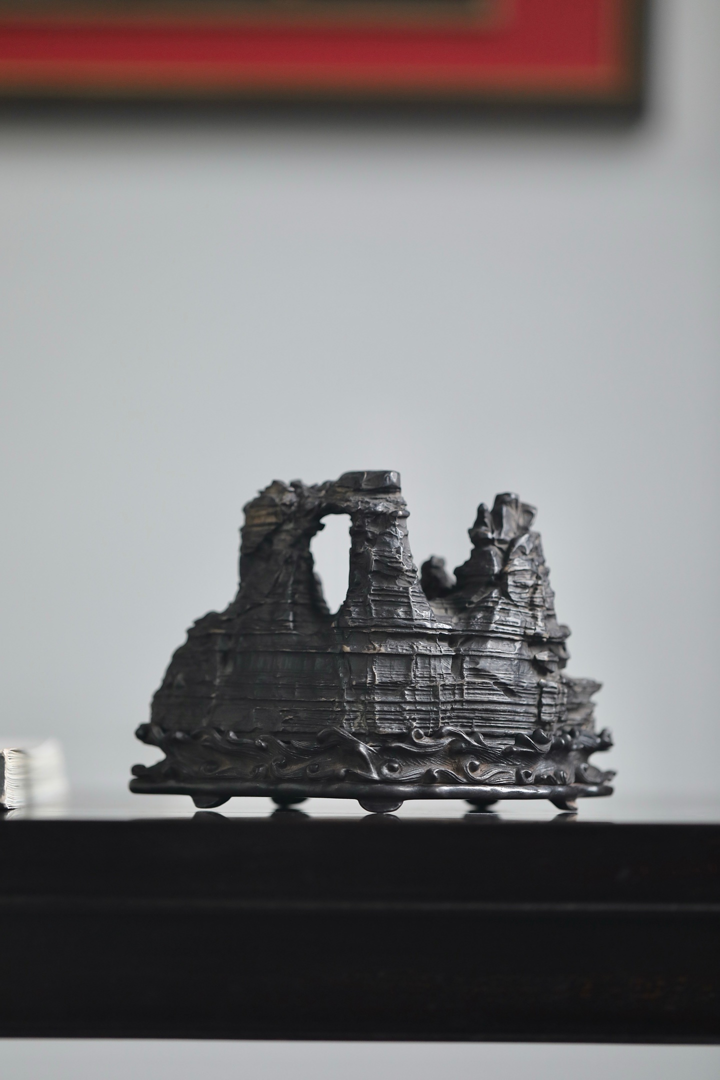 灵璧石 | 山子这方灵璧石山子,纹理如被风雨侵蚀过的层层岩崖,每一道褶皱都饱经沧桑。它的形态不是一味的奇崛,而是在苍古中透着稳重。主峰挺拔,次峰相依,那处天然的孔洞,更像是岁月在山体上留下的印记,虚实之间,自有一番深沉的古韵。24×9.6×13cm