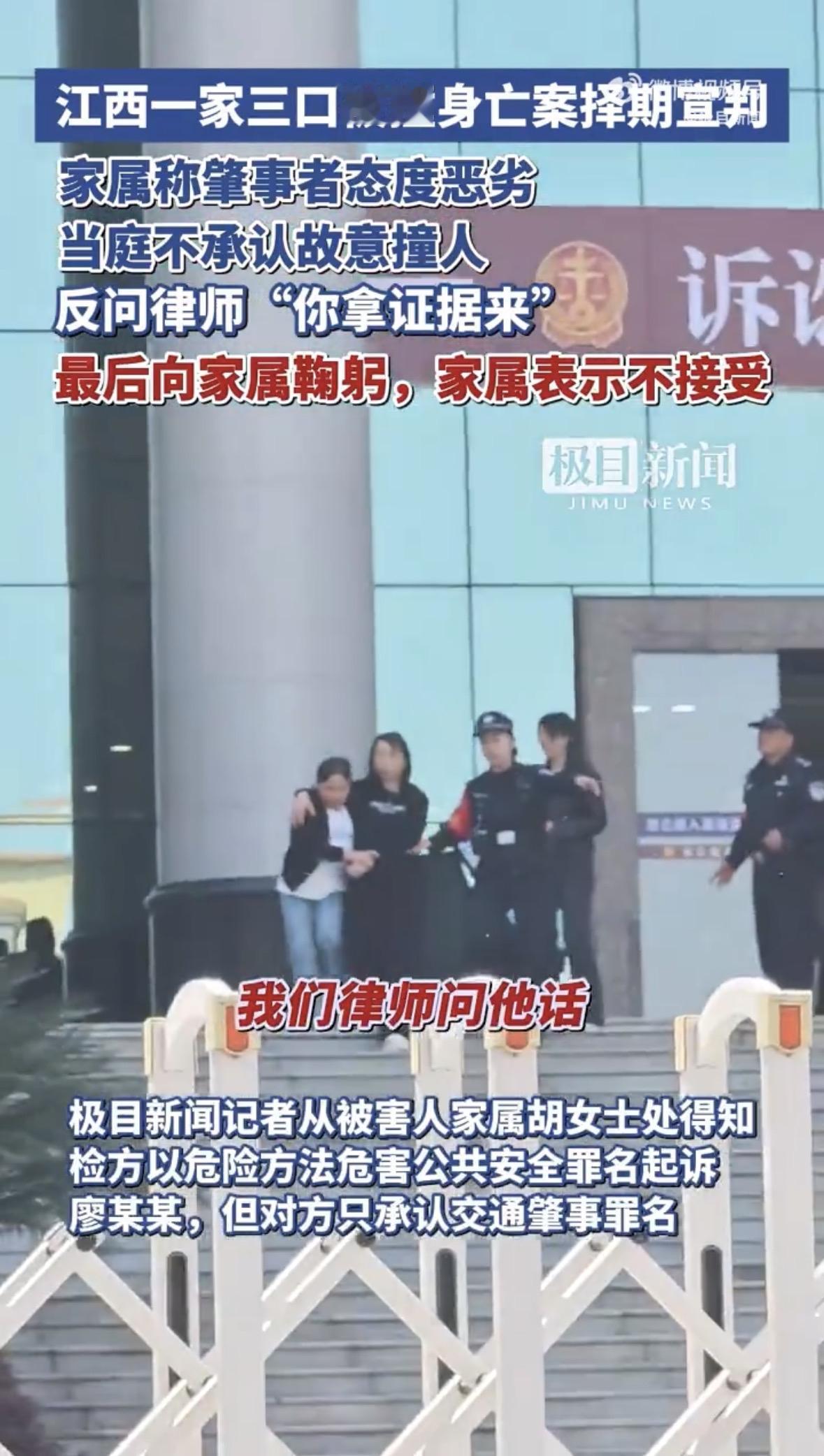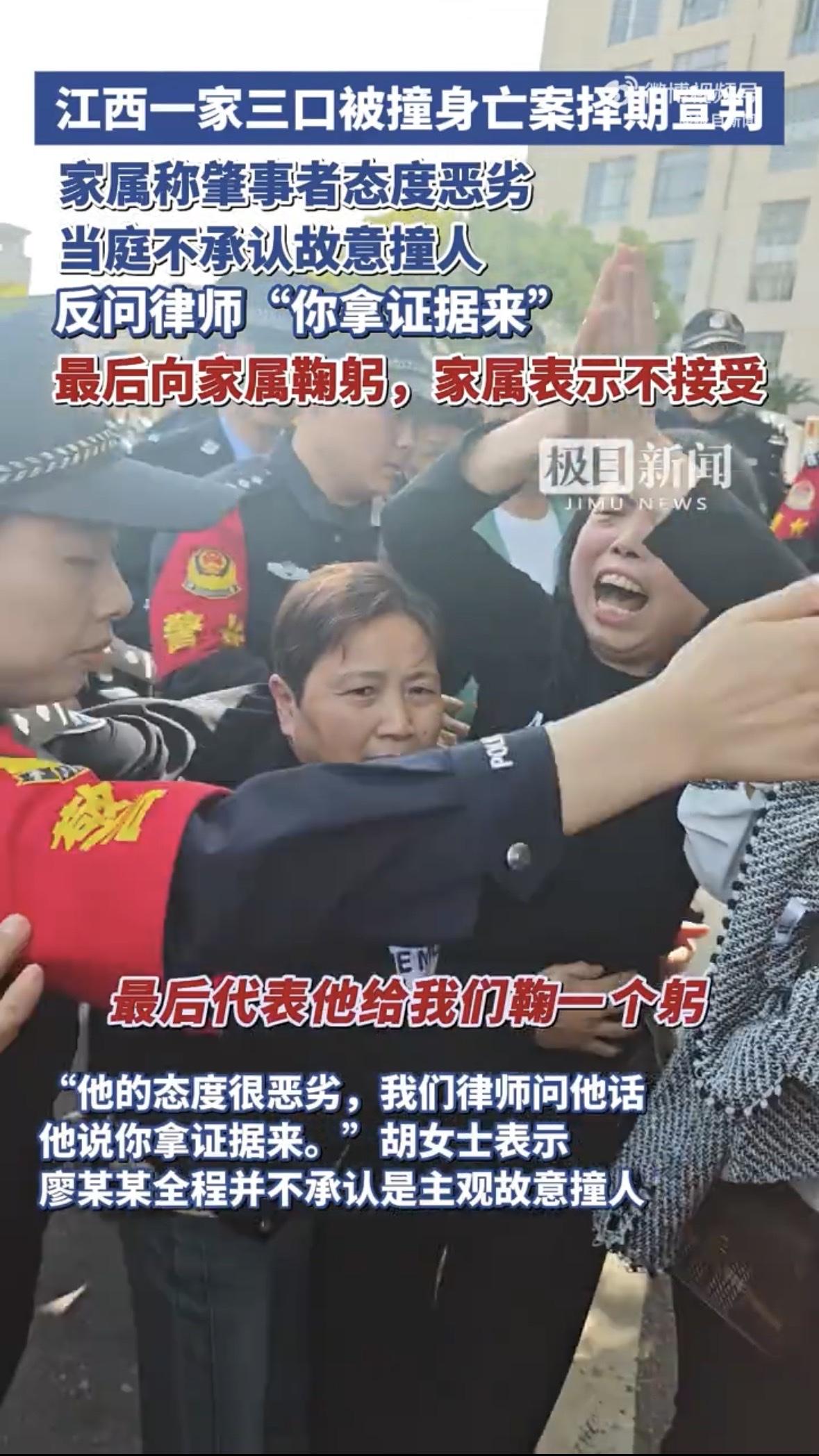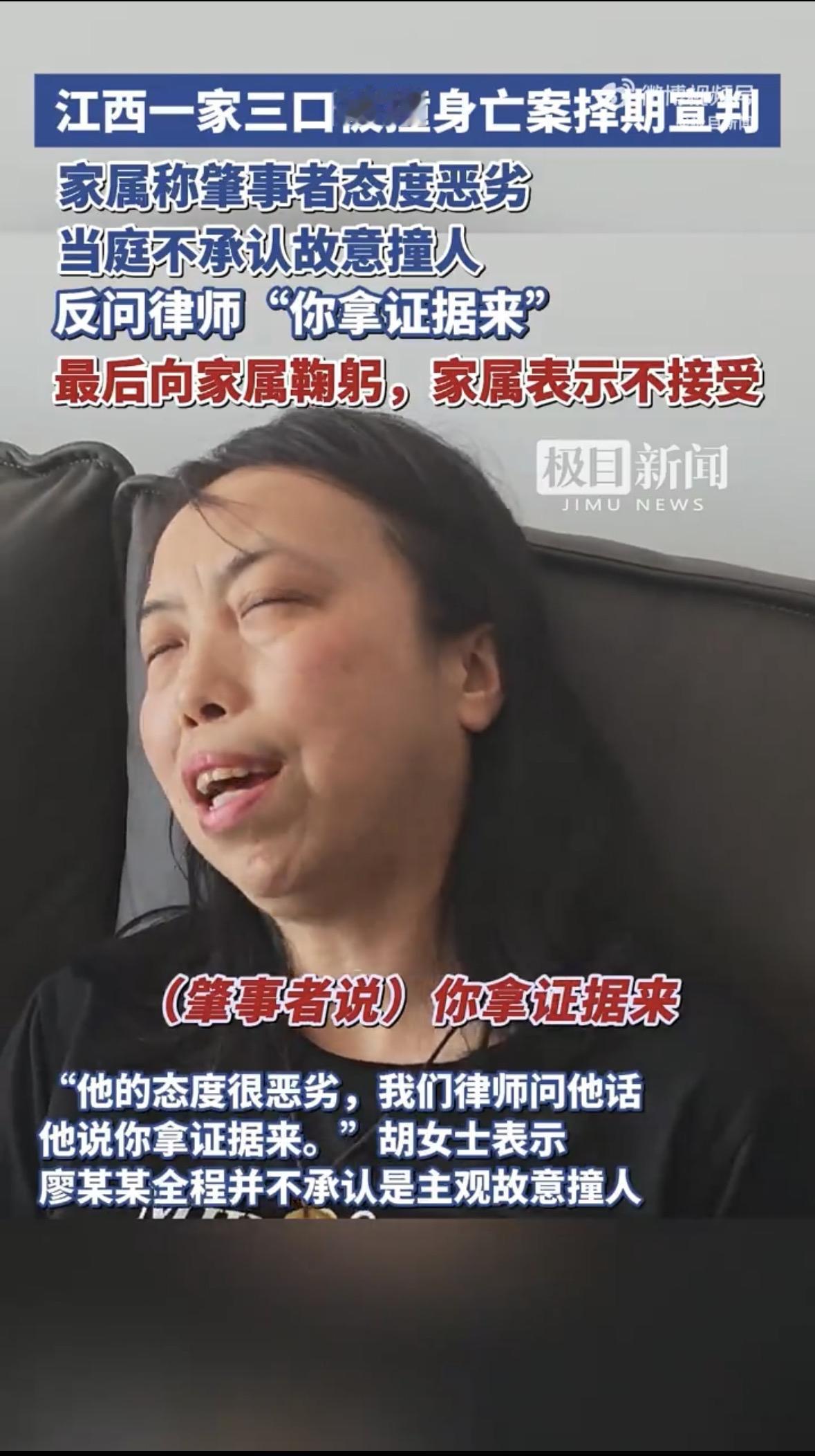 江西这起惨案太揪心了。31岁的丈夫、30岁的妻子、不满周岁的孩子,一瞬间全没了。只因肇事司机和女友吵架,竟把马路当泄愤场!凶手父亲事后说“愿让儿子去尽孝赎罪”。这话听着像悔过,可落在失去独子、儿媳、孙子的老人耳朵里,简直是往血淋淋的伤口上撒盐。 受害者母亲胡女士的话字字诛心:“让害死我儿子全家的人来给我们养老,怎么可能!”460多天的等待,三次延期的庭审,老两口等判决等到抑郁。他们要的不是虚无的“赎罪表演”,而是法律给一个明明白白的交代。 悲剧已经发生,但有些伤害永远无法“弥补”。真正的人性觉悟,该是彻底反省错误、承担该受的惩罚,而不是用这种自以为是的方式,再次刺痛受害家庭。支持老人坚决拒绝,也相信法律会给出公正的答案。