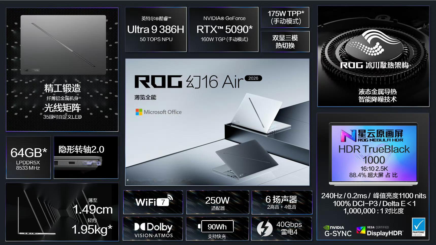 ROG 这次 CES2026 的新品确实有点东西。最吸引我的是 幻16 双屏,直接塞进两块 16 英寸大屏,展开约等于 21 寸,这才是真正的双屏生产力,不像以前那种只能当工具栏的窄条副屏。配置堆到了酷睿 Ultra 9 和 RTX 5090,虽然散热压力看着不小,但创意绝对满分。幻14/16 Air 系列继续卷轻薄性能,全系升级 RTX 50 系显卡。特别是幻16 Air,在不到 2kg 的机身里要把功耗干到 175W,这调教有点激进,但我喜欢。台式机 枪神10X 更离谱,机箱里搞了个全息投影风扇,也就是 ROG 能在“光污染”上玩出这种新花样。总的来说,今年全是硬核堆料,性能和屏幕素质都没得挑,唯一的悬念就是大家钱包够不够厚了。