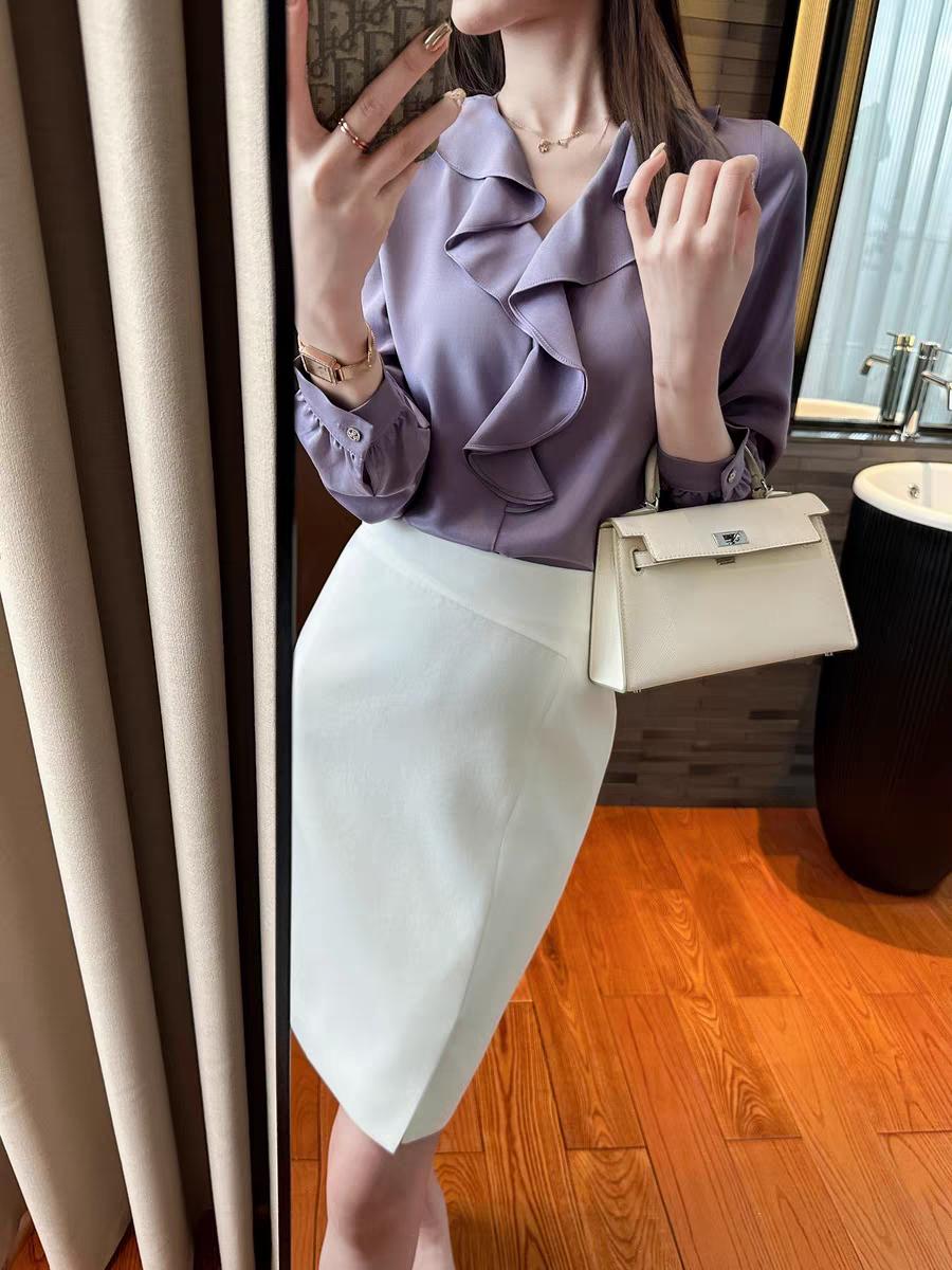 高质感通勤两件套,简约版百搭修身白衬衫+高腰包臀半身裙套装。白色衬衫套装裙 喜欢