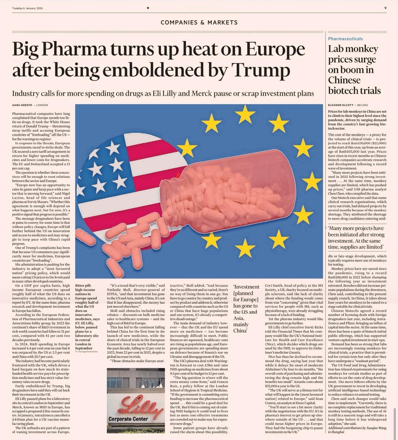 中国猴子火热让欧洲医药界捉急。 欧洲真的可能要全面衰落了,能看得见的电动汽车、日用品、机械都在落后。在医药方面,欧洲也远远落在了美国和中国的后面。 英国金融时报FT正在替欧洲担心 。 从他们的看法来看,在医药争夺战的过程之中,欧洲再次落后。 美国有本土政策,而中国有很多实验室猴子。欧洲只有繁琐的程序 中国生物医药产业的崛起并非单一环节的优势,而是从基础研究→临床前试验(含实验动物供应)→临床试验→商业化生产的全链条协同。 从上游看,实验动物培育、基因编辑等技术成熟,保障研发“原材料”供应(如实验室猴子的规模化养殖与合规供应)。 而在中游看,CRO(合同研究组织)、CDMO(合同研发生产组织)等第三方服务高度发达,可高效承接全球药企的研发外包需求。实际上在这一块,韩国三星在大分子方面有独到的优势,但是在小分子CDMO这一块则是中国的天下。 下游有医院、药企的临床资源丰富,有足够多的病人。且医保、商保等支付端逐步完善,支撑创新药从“研发”到“落地”的闭环。 最重要的就是中国从2015年医药审批制度改革之后,大大加速了新药的审批流程。再加上前五年有大量的医药投资,他们有的变成了泡沫,有的变成了废渣,但是一批新的公司在这上面崛起。 这种生态雨林效应,让中国在全球医药研发分工中从“追随者”向“引领者”进阶。 美国药企正在因为本土政策而回归美国。正如礼来和默克那样,在欧洲的投资却在暂停或减少。 实验室的动物其实很昂贵的,一只猴子可能超过130万人民币。猴子持续涨价,意味着中国在全球医药创新版图成为不可忽视的支柱