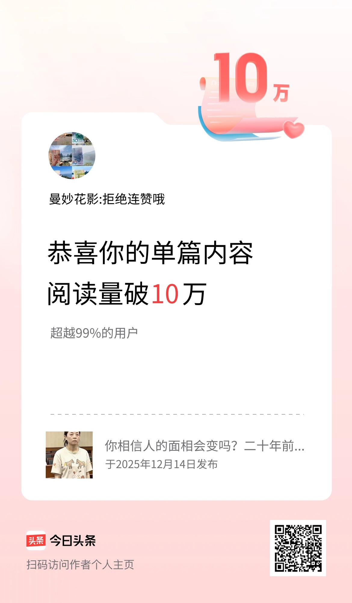 单篇内容获得阅读量破10万啦!