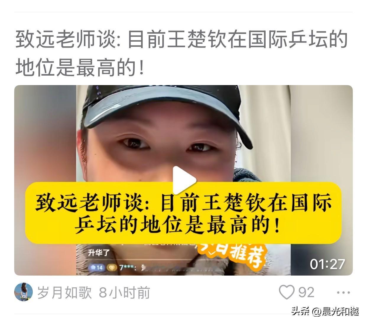 目前王楚钦在国际乒坛的地位是最高的!给王楚钦这一定位的,是一位主播致远人称致远老师。 同时致远老师还知道樊振东,说当然还有樊振东,不过跟我没有关系就不提了。 实在不知道致远老师是教什么的,咱也就暂放一边,说一说国乒队员吧: 巴奥前樊振东说,我和王楚钦对球队都很重要!两年后的洛奥前,樊振东这句话仍将是正确的。 国乒主教练王皓也给了王楚钦定位,新的奥运周期里在男队中,王楚钦要起到承上启下的作用! 从王皓的话中,期待着王楚钦向老大哥们学习;从樊振东的话中,这是最好的国乒队友情。
