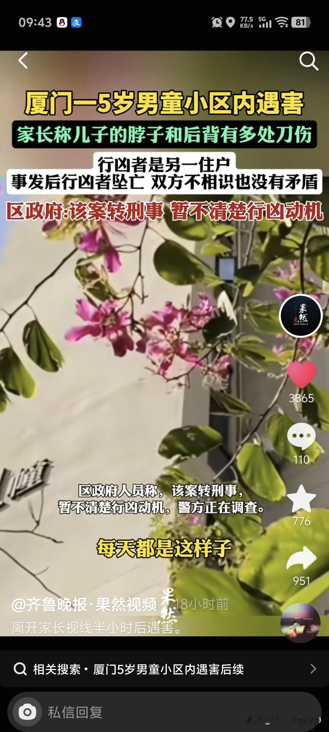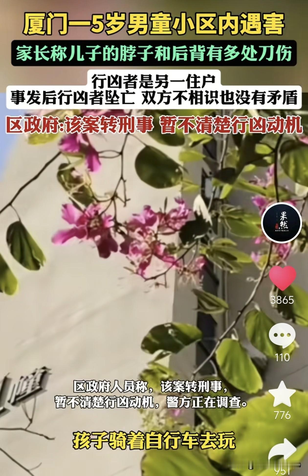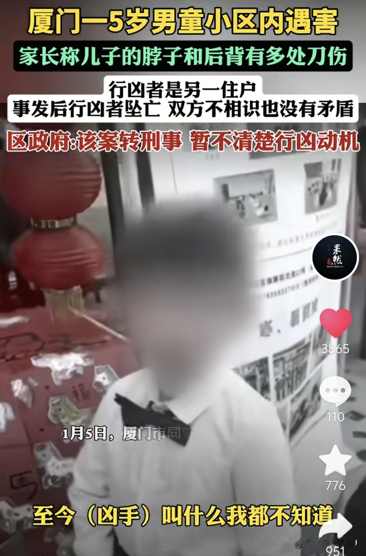 厦门5岁男童遇害背后,有些让人感到疑惑。一个59岁的老太太自己应该也早就做奶奶的人了,她为什么要杀害一个无辜的小孩子? 根据媒体的相关报道,事情大概是这样的。 悲剧发生在12月29日晚上,5岁的小男孩在小区里玩耍,脱离家长视线约半个小时后被发现遇害了,而行凶者也坠亡了。 更让人疑惑的是,行凶者老太太没有留下一句话,紧接着就畏罪跳楼自杀了!是什么事情让她去伤害一个5岁的小男孩,紧接着又结束了自己的生命。 这个悲剧发生后,有物业的相关人员称,听居民说曾见过行凶者与小孩家属争吵。 但孩子母亲则称,家人未曾与行凶者有矛盾。连凶手叫什么她都不知道,自己儿子太冤了。当时孩子是和两个奶奶一起出去的,然后孩子骑着自行车去玩了,每天都是这个样子的。等她回来时,奶奶是从电梯哭着下来的。 现在行凶者也不在了,那么她的动机究竟是什么,一时半会估计也很难说得清楚。具体的一切,都要等警方调查后才能知晓了。 老话说,忍一时风平浪静,退一步海阔天空,无论发生了什么事,有什么矛盾都应该用理性的方式去解决,万万不应该去伤害无辜的孩子。现在,不仅害了别人的家庭,自己的家庭又何尝能好过呢?一下子毁了几个家庭,这样值得吗? 出门在外,希望大家一定要多加注意:万事以和为贵,尽量不要和人发生冲突。特别是带孩子时,千万不要让他们离开自己的视线范围,以免发生让自己后悔的事。