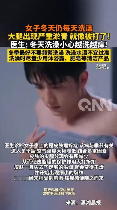 “悲剧还是发生了!”近日,湖南长沙,一女子进入冬季后依然坚持每天洗澡,这天他在家中洗澡时,浑然感觉身上发痒,挠痒后身上抓痕由鲜红色变成深紫色,像被人打了一样,于是前往医院就医。医生:不要频繁洗澡! 那日下班归家,杨女士(化名)只觉浑身酸痛难耐,像往常一样她拧开水龙头,接了一盆热水,准备享受泡澡的时光,起初,她沉浸于泡澡的舒缓之中,身体的疲惫也渐渐消散。 可没过了一会杨女士就感觉到浑身心痒痒,后来她便看到身上 在医院,皮肤科医生详细检查了她的皮肤状况后,给出了专业解释,医生指出,杨女士的症状主要是由于冬季频繁洗澡导致的皮肤损伤,进入冬季后,空气寒冷干燥,本身就容易使皮肤水分流失。 要是在现在干燥的天气还依旧每日用热水冲洗,会加剧皮肤干燥,甚至还会引发瘙痒、红斑,渗血,医生建议,冬季洗澡频率宜适当降低,通常每周1至2次便可。 此外洗澡的温度也不能太高,同时,每次洗澡后应使用保湿效果好的身体乳进行护理,帮助恢复皮肤水分和保护屏障。 医生还特别提醒,冬季皮肤干燥不仅容易出现瘙痒和裂口,长期忽视还可能引发湿疹等皮肤疾病,对于皮肤敏感的人群,更应注意洗护习惯的调整。 杨女士的经历在网络上引起了广泛关注,许多网友留言表示认同,有人坦言自己也存在“冬季洗澡上瘾”的情况,有时为了保持干净或舒适感,几乎每天洗澡,但洗完后皮肤会干得紧绷、起皮。 还有网友分享了自己的经验,称冬季减少洗澡次数、改用温水短时冲澡,并且及时涂抹身体乳,皮肤状况明显改善,也有网友提醒家里老人和孩子,冬季皮肤更脆弱,需要在洗澡和保湿上格外注意。 那么通过这件事也提醒人们,日常生活中的小习惯也可能对健康产生重要影响,洗澡虽是保持清洁的必要行为,但过度频繁或不注意方式方法,尤其在冬季干燥环境下,可能适得其反,导致皮肤出现红斑、瘙痒甚至破损。 总之,冬季洗澡应量力而行,不追求频繁,也不要忽略皮肤护理,保持皮肤水分和保护屏障,比每天洗澡更重要,通过合理的洗护习惯,每个人都能度过一个舒适又健康的冬季。 信息来源:青岛新闻网