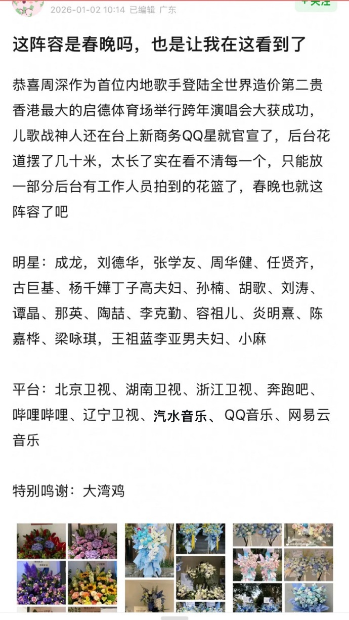 周深香港启德演唱会,两场十万人的奔赴,单场五万人的同频共振,线上更有全球127国560万网友云端跨年,一举刷新华语演唱会直播纪录。启德零售馆透露,除夕当天客流量突破12万人次,人气爆棚可见一斑!成龙、刘德华等乐坛前辈助阵,高朋满座,热度直接断层领跑! 周深启德高朋满座