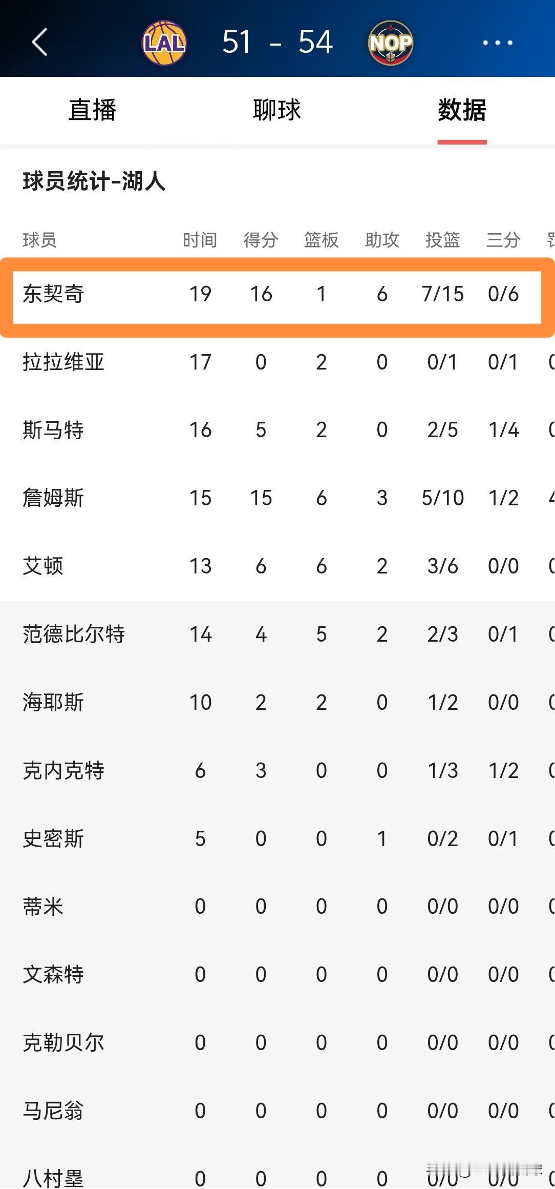谁可以拯救一下湖人球星东契奇的三分球?在今天湖人客场挑战鹈鹕的上半场比赛中,东契奇在三分线外的手感真是糟糕到了极点,他在首发出战的19分钟里,投篮15中7,其中三分球6中0、罚球3中2得到16分1篮板6助攻2抢断,目前湖人以51:54落后对手结束了前两节的比赛。 毫不夸张的说,如果东契奇在接下来的下半场比赛中依然无法命中三分球的话,那么湖人必败无疑。