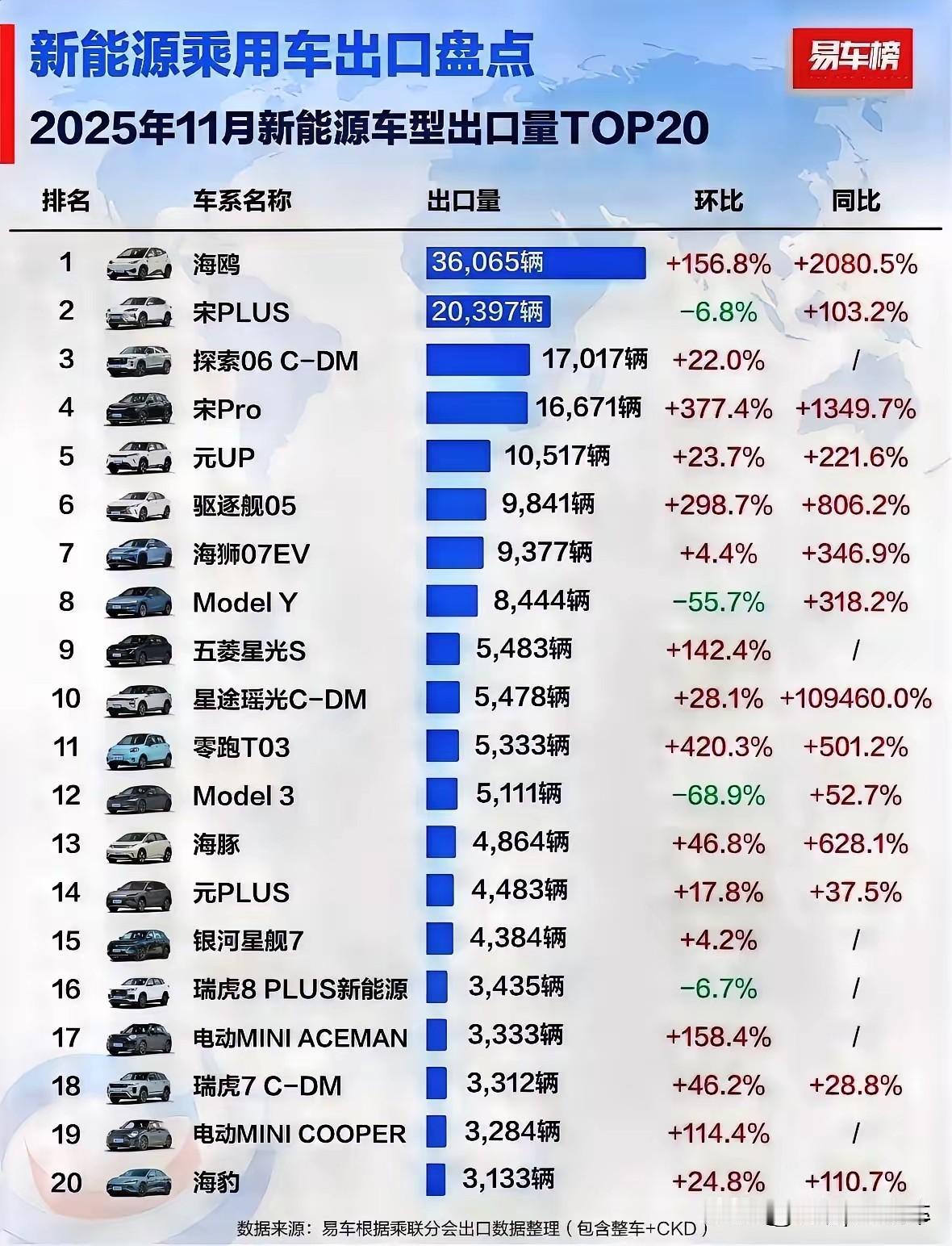 赤裸裸的现实来了,加满50升油箱: 美 国:约需370元人民币! 日 本:约需440元人民币! 英 国:约需630元人民币! 法 国:约需676元人民币! 俄 罗斯:约需240元人民币! 沙 特:约需226元人民币! 伊 朗:约需12元人民币! 中 国:约需360元人民币! 中国新能源车出海成绩单!海鸥3.6万辆夺冠,比亚迪9款车霸榜 2025年11月中国新能源汽车出口市场再传捷报,乘联会发布的出口量排行榜揭开了国产车型征战全球的亮眼表现。比亚迪海鸥以36065辆的出口量登顶榜首,成为榜单中唯一突破3万辆的车型,而比亚迪更是凭借9款车型入围前20的强势表现,成为中国新能源车出海的核心力量。 作为此次榜单的最大赢家,比亚迪海鸥的出口数据堪称惊艳。3.6万辆的单月出口量,不仅远超第二名近1.6万辆,环比增长更是达到156.8%,同比增幅更是高达2080.5%,两年多时间累计销量已突破百万辆。这款定位入门级纯电车的车型,之所以能在全球市场掀起热潮,离不开精准的产品定位与本地化适配。在巴西市场,它上市首月就斩获七千多辆订单,如今市场占有率已过半,85%的消费者将其作为家庭第二台车,亲民价格与400公里左右的续航,完美契合日常通勤需求。而在欧洲的法国、意大利等国,适配当地充电桩网络的设计,也让它成为城市出行的热门选择。 比亚迪的出海实力不止体现在单一车型上,榜单前20中9款车型的入围,展现了其产品矩阵的全面竞争力。宋PLUS以20397辆位居第二,宋Pro 16671辆紧随其后,元UP也以10517辆跻身前五,从入门级到家用主流车型,全方位覆盖不同市场需求。2025年1-11月,比亚迪乘用车累计出口87.8万台,同比增长144%,在巴西、土耳其、意大利等多个国家拿下新能源销量冠军,甚至在11个核心市场的销量全面超越特斯拉,成为全球新能源市场的重要玩家。 除了比亚迪的强势领跑,自主品牌出海也呈现多点开花的态势。奇瑞探索06 C-DM以17017辆的出口量位居第三,这款售价11.39万起的插混SUV,凭借前置前驱的实用布局与亲民定价,在海外市场收获不少青睐。11月整体新能源乘用车出口量达到28.4万辆,同比增长243.3%,1-11月累计出口更是高达215万辆,增长82.6%,远超燃油车出口增速,印证了中国新能源汽车在全球市场的竞争力。 中国新能源车出海的爆发,背后是产品力与本地化策略的双重支撑。比亚迪为海外市场量身优化车身涂层以应对雨季腐蚀,奇瑞等企业则通过精准定价覆盖更多消费群体。从亚洲到美洲、欧洲,中国车型正凭借性价比、续航表现与智能配置,改变全球消费者对中国汽车的认知。1-11月新能源出口占自主出口比例已达40.6%,墨西哥、阿联酋、英国等成为核心增长市场,中国汽车正从产品出海迈向品牌全球化。 这场由中国品牌主导的新能源出海浪潮,不仅改写了全球汽车出口格局,更彰显了中国汽车产业的技术沉淀与创新活力。你觉得下一款能在全球爆火的中国新能源车会是谁?