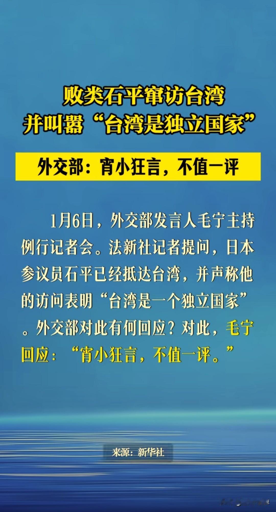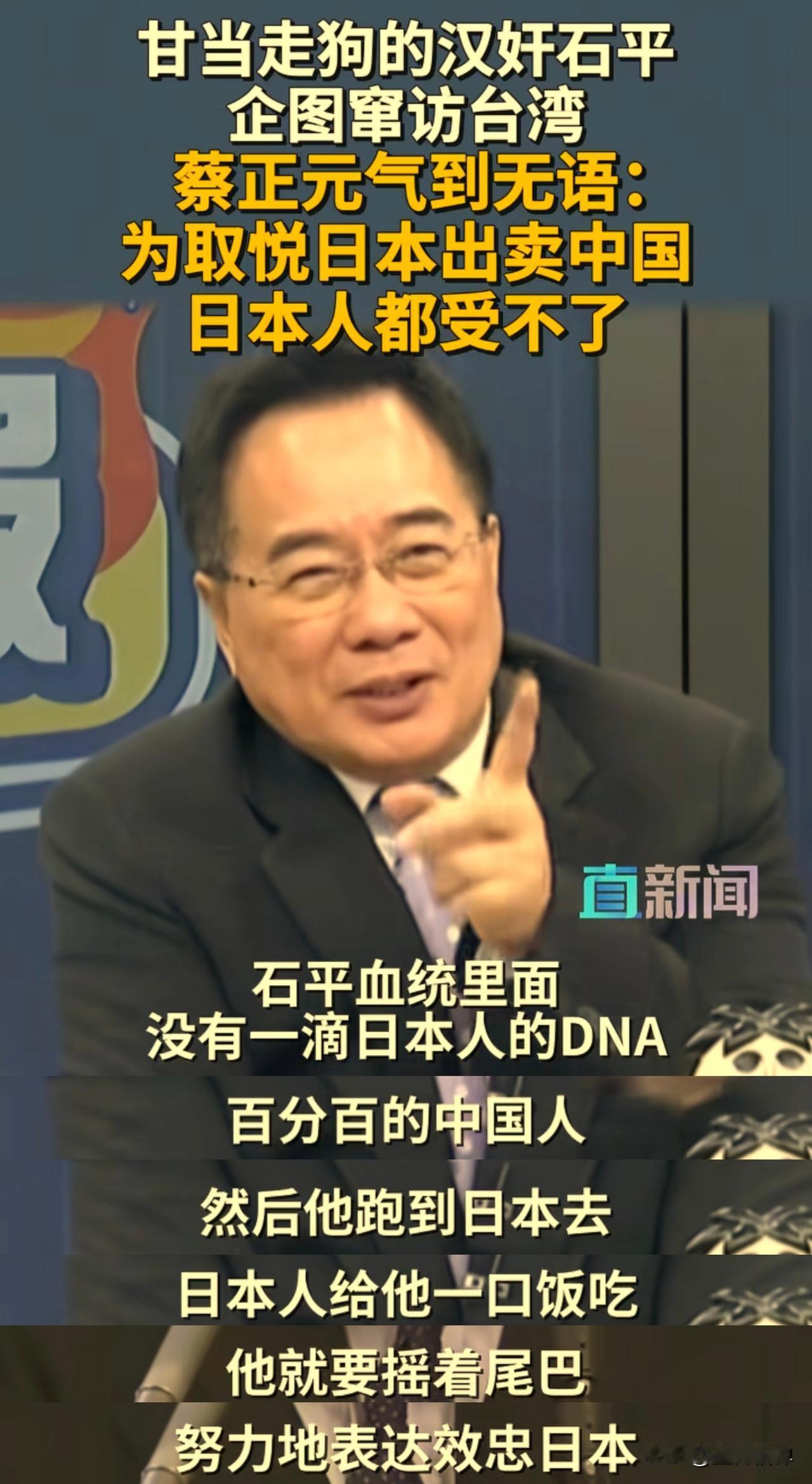 蔡正元评价石平说:“有一些假日本人,这种人就很奇怪,石平血统里面没有一滴日本人的DNA,百分之百的中国人,然后他跑到日本去,日本人给他一口饭吃,他就要摇着尾巴努力的表达效忠日本”。 上日本的一个节目的时候,连主持人都看不下去了,说我们日本批评中国,好像还没有你这么激烈啊,这种人为了讨好日本人黑的白的乱讲一通。 1月6日,中国外交部发言人毛宁主持例行记者会,在回应石平窜访中国台湾地区时表示:“宵小狂言不值一评”。 石平1962年出生于中国四川成都,2007年加入日本国籍,2025年7月当选日本国会参议员。石平加入日本国籍后,长期散布虚假消息,攻击抹黑中国。 中国外交部明确指出,石平的行为是“数典忘祖、出卖良知”,驻日使馆也批评其“通过出卖良知来捞取私利的行为令人不齿”。 石平