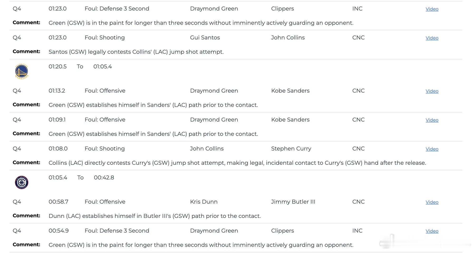 昨天勇士VS快船最后两分钟裁判报告:误判3次,均对勇士有利!报告显示,在比赛还剩1分40秒时,阻挡了克里斯-邓恩的跑动路线,并在掩护过程中与邓恩发生身体接触,此处应判罚格林进攻犯规但并未吹罚,属于漏判。在比赛还剩1分23秒时,德雷蒙德-格林在禁区内停留时间超过三秒但并没有积极防守对方球员,此处应吹罚格林防守三秒违例但并未吹罚,属于漏判。在比赛还剩54.9秒时,德雷蒙德-格林在禁区内停留时间超过三秒但并没有积极防守对方球员,此处应吹罚格林防守三秒违例但并未吹罚,属于漏判。
