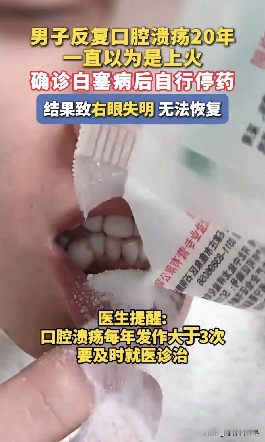 20年口腔溃疡只当是上火,直到右眼彻底失明,这位西安王先生才知道,自己踩了多大的坑! “上火了吧?喝点凉茶就没事了!”这话是不是听着贼耳熟?可西安的王先生怎么也想不到,自己就信了这句“老话”,硬生生扛了20年口腔溃疡,最后竟然把右眼给搞失明了,而且再也没法恢复! 王先生打二十多岁起,嘴里就没消停过,口腔溃疡那是一波接一波。有时候一个月能冒出来三四回,疼得他吃饭嚼不了、说话张不开嘴,连咽口水都跟吞刀片似的。可他和家里人都没当回事,觉得就是普通上火,要么硬扛着等它自己好,要么去药店随便买瓶降火的药对付两下,溃疡一消,这事就算翻篇了。 这一扛,就是整整二十年! 直到去年,王先生的口腔溃疡不仅没好转,反而更严重了——眼睛突然开始红肿发烫,看东西像蒙了一层厚雾,模模糊糊的啥也看不清。一开始他还以为是熬夜熬的,滴了几天眼药水也没见好,视力反而越来越差,到最后连眼前的人影都快认不清了。这时候他才真慌了,赶紧跑到医院挂了号。 检查结果出来的那一刻,医生的话简直像一盆冷水,把他浇了个透心凉:这根本不是普通的口腔溃疡,而是白塞病——一种能攻击全身的自身免疫性疾病!口腔溃疡只是它的“小把戏”,要是不赶紧规范治疗,还会连累眼睛、关节、血管,甚至是内脏器官! 医生立马给他制定了治疗方案,让他按时吃药、定期复查。没过多久,王先生的口腔溃疡真的少了很多,眼睛也慢慢清亮起来,看东西终于不费劲了。可他这心刚放下没两天,就犯了个致命的错:觉得自己“彻底好了”,再加上怕长期吃药伤身体,竟然偷偷把药给停了! 谁能想到,才过了半年,他的右眼突然一阵剧痛,再一睁眼,世界直接变成了一片漆黑!他疯了似的冲到医院,医生检查完直摇头叹气:眼部组织已经遭了不可逆的损伤,就算再怎么治,视力也再也回不来了。 “口腔溃疡要是一年犯超过3次,就别再当成‘上火’糊弄了!”接诊的医生说起这事满是惋惜。白塞病的早期症状太容易被忽略,好多人像王先生一样,把反复的小溃疡不当回事,硬生生拖过了最佳治疗时机。而确诊后擅自停药,更是直接把自己推进了失明的大坑! 其实生活里,不少人都被口腔溃疡缠过。但很少有人知道,这种看着不起眼的“小毛病”,背后可能藏着要命的隐患。 这儿也想提醒大伙儿:身体发出的每一个“小信号”,都别轻易放过。尤其是那些反复出现、怎么也不见好的症状,一定要赶紧去医院检查,乖乖听医生的话治疗。千万别凭着自己的感觉硬扛,更别擅自停药!不然的话,你省下的那点药钱、图的那点省事,最后可能会让你付出一辈子都没法挽回的代价!