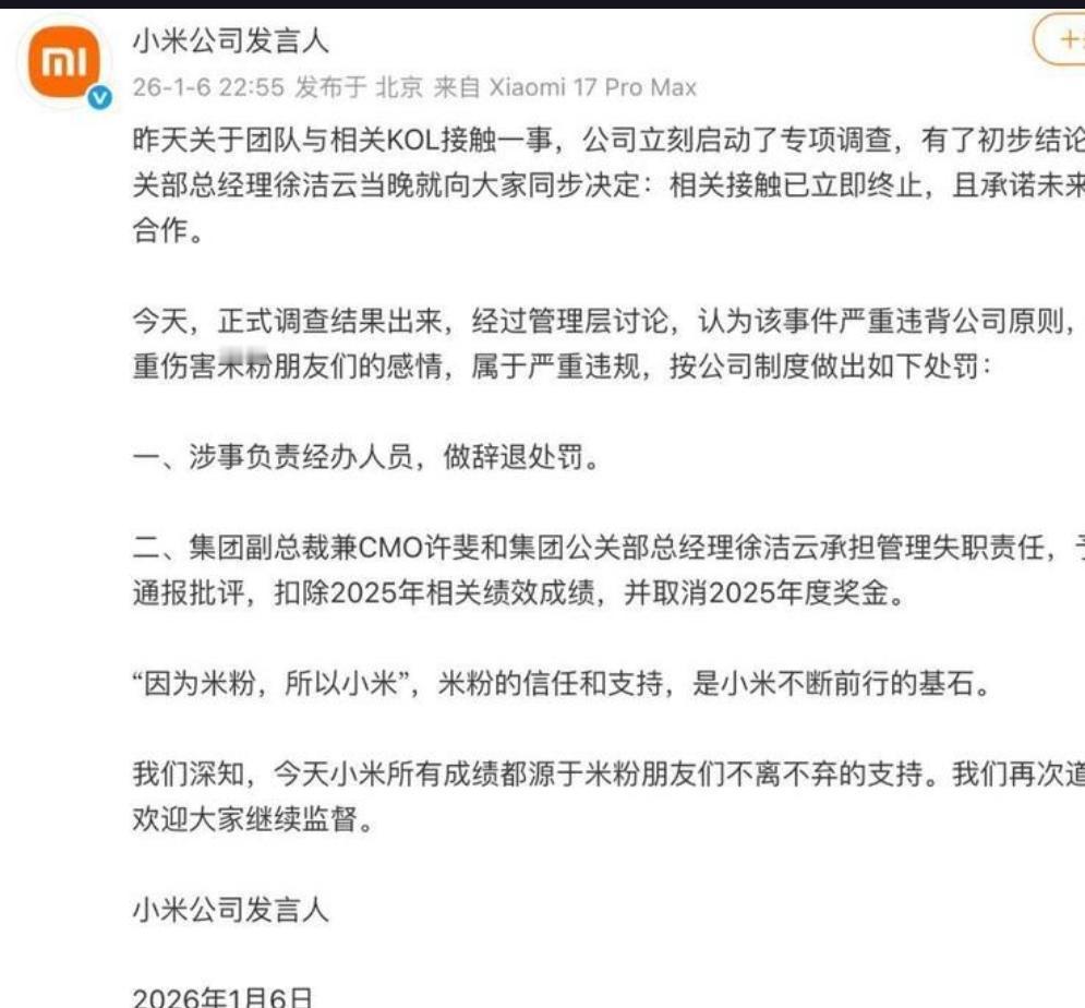 小米KOL合作风波警示:粉丝信任如何一夜崩塌? 最近小米摊上事了,公关团队因为和KOL的不当合作,引发了广泛关注。具体怎么回事?简单说就是合作方式出了偏差,严重违背了公司原则,伤害了“米粉”的感情。处理结果很快出来了:涉事员工直接被辞退,连集团副总裁兼CMO许斐和公关部总经理徐洁云都被通报批评、扣绩效、取消年终奖。看来小米这次是真下狠手了。 这事儿表面看是操作不当,但背后其实是所有企业都在面临的难题:如何处理好和用户、和粉丝的关系? 小米一直说“和用户交朋友”,但朋友之间最怕什么?最怕欺骗和不真诚。 其实类似的事件在科技圈并不少见。前两年有厂商因为评测机区别对待,被用户骂上热搜;去年也有品牌因为售后问题,导致大量粉丝转黑。数据显示,79%的消费者表示,一旦发现品牌不诚信,会立刻停止购买。粉丝经济时代,信任建立起来难,崩塌起来却特别快。 小米这次的处理算是快刀斩乱麻,但伤害已经造成。有米粉在社区留言说:“感觉被自己人骗了。”这句话挺扎心的。企业做营销,搞合作都没问题,但底线不能丢——对用户保持透明和尊重。 这件事也给所有企业提了个醒:在流量为王的时代,千万不要为了短期数据,丢了最核心的用户信任。毕竟,产品可以迭代,营销可以重做,但粉丝心寒了,想再捂热就难了。 你们怎么看这次事件?觉得企业的处理够力度吗?如果你是品牌方,会怎么平衡营销效果和用户信任?评论区聊聊。小米争议 雷军营销争议 小米公司 小米黑公关案件 小米通报 小米黑公关 小米高管争议 小米成都事故小米售后陷阱 小米离职潮 小米品牌互动 小米互部年会