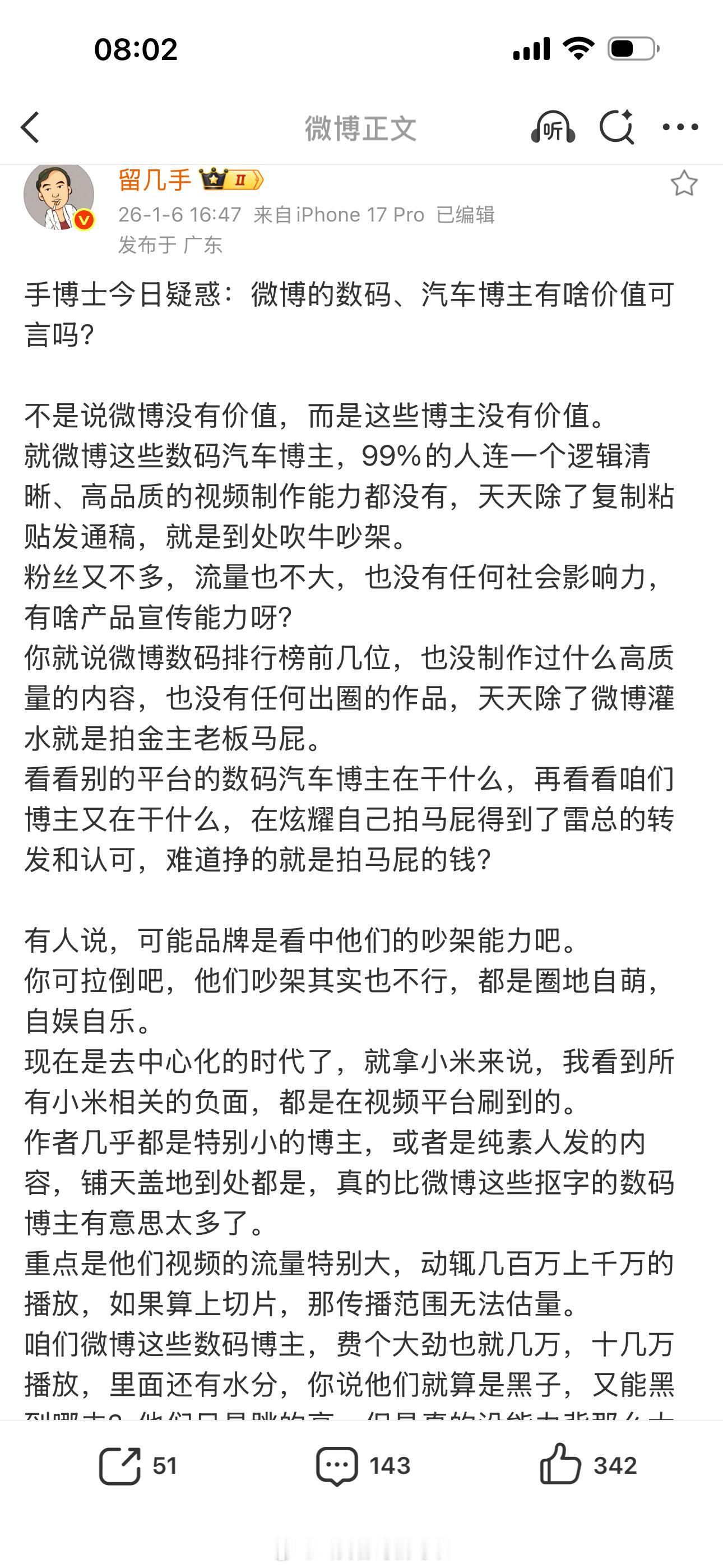 小米徐洁云被通报批评对公关一把手确实狠了点,但对小米来说绝对是好事。小米维护米粉情感价值的目标高于一切,这才是做好一个公司的根本,而不是去花钱维护一个反对派。但正如一些圈外人所闻所见,很多数码媒体其实都是自嗨,所谓的流量来来去去就圈内几个人在吵架而已,粉丝从来没有因为他们去买任何他们维护的公司或产品。明眼人都知道,数码媒体在买粉养粉维护水军的方式上可以低成本运作,但没点屁用。围脖本身就是一个价值很普通的平台,不信你看看这些人有几个在B站在抖音这些很难造假的平台上活跃就知道了。而有些所谓的大v其实也就是靠抽奖了来维护用户,来来回回也就那平时抽到奖的几百个人在互动,还是老刘看得清啊!