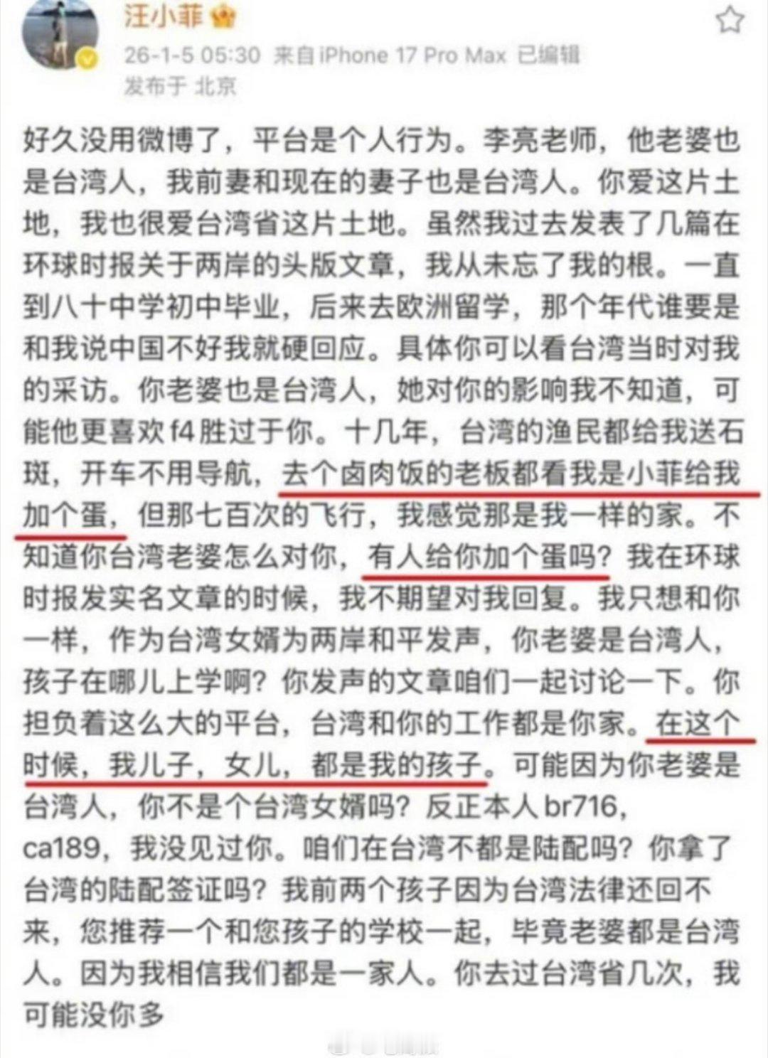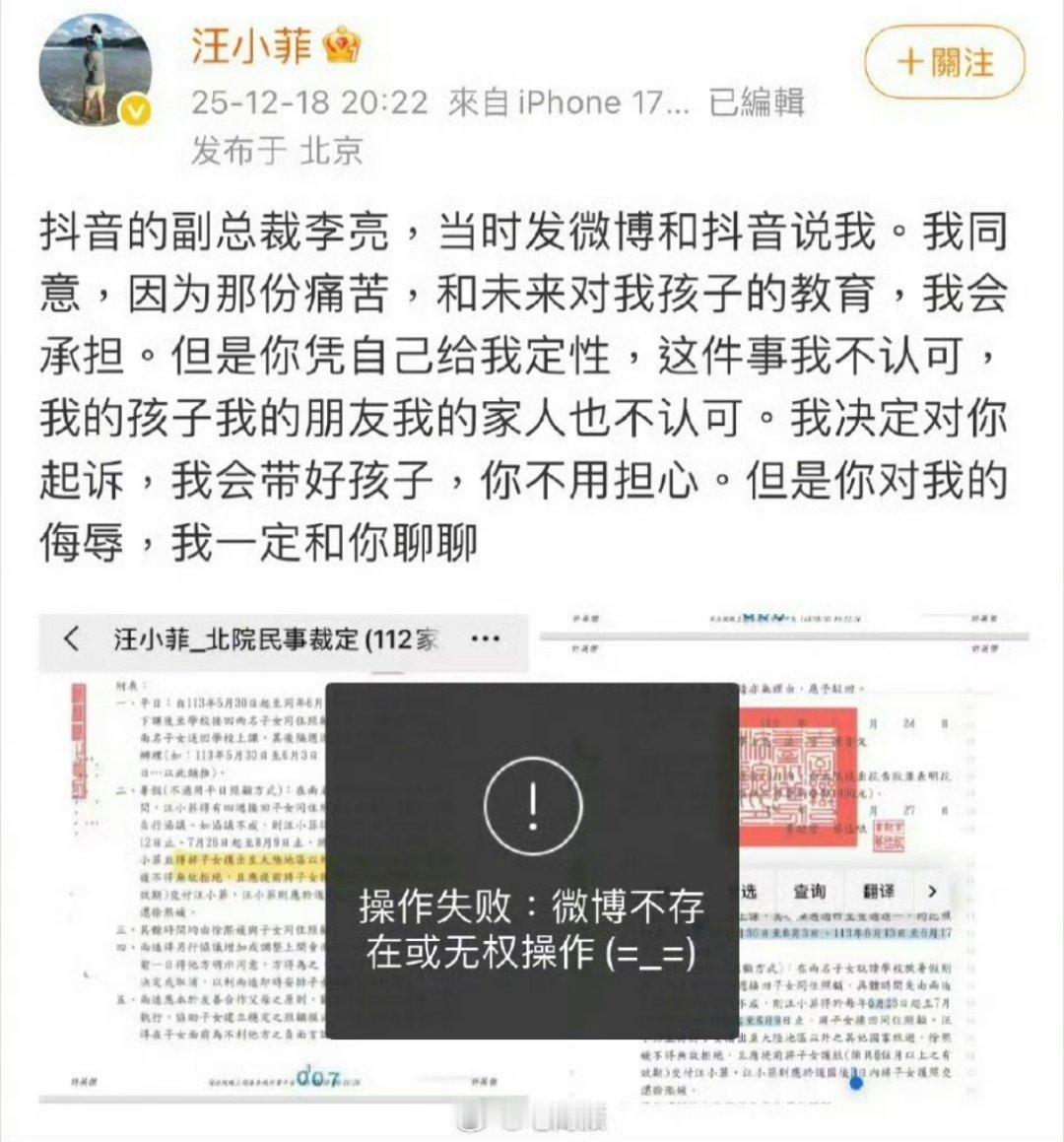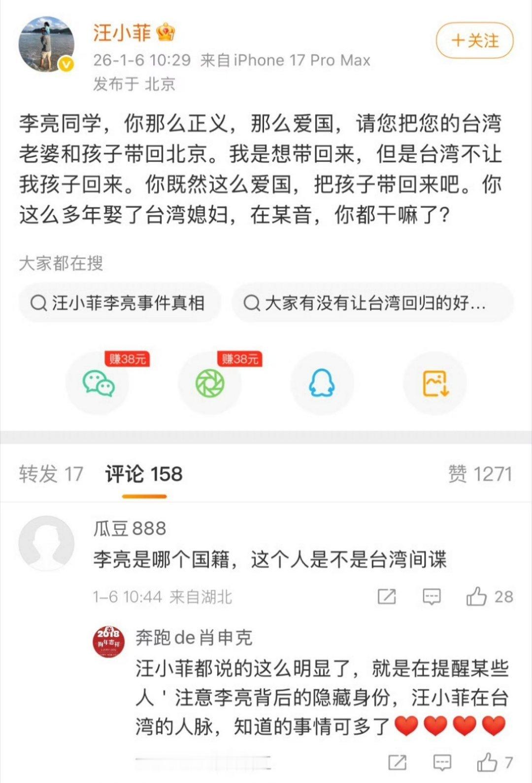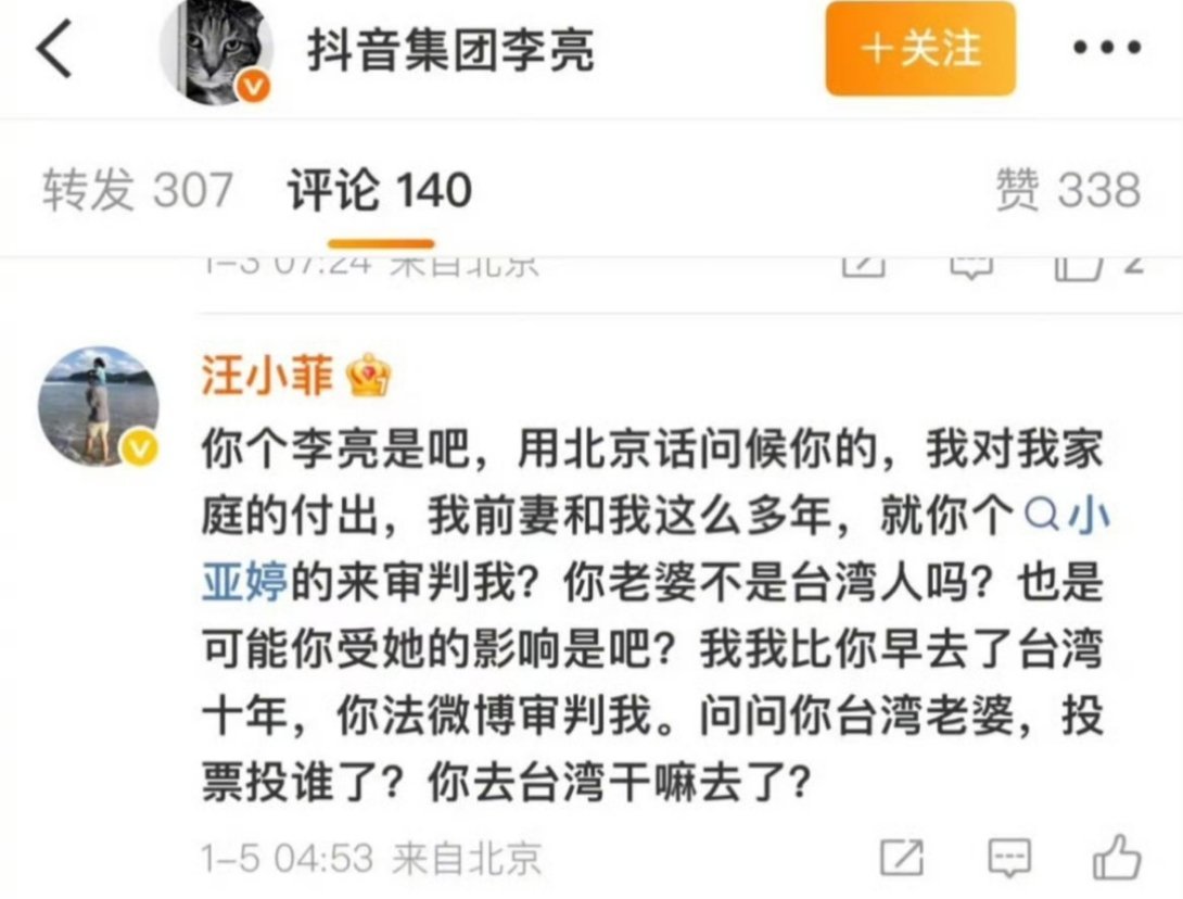 汪小菲换马甲抖音复出再次被封禁。这次他怒了,选择公开抨击抖音集团副总裁李亮,称他老婆和孩子在台湾也不回大陆。
