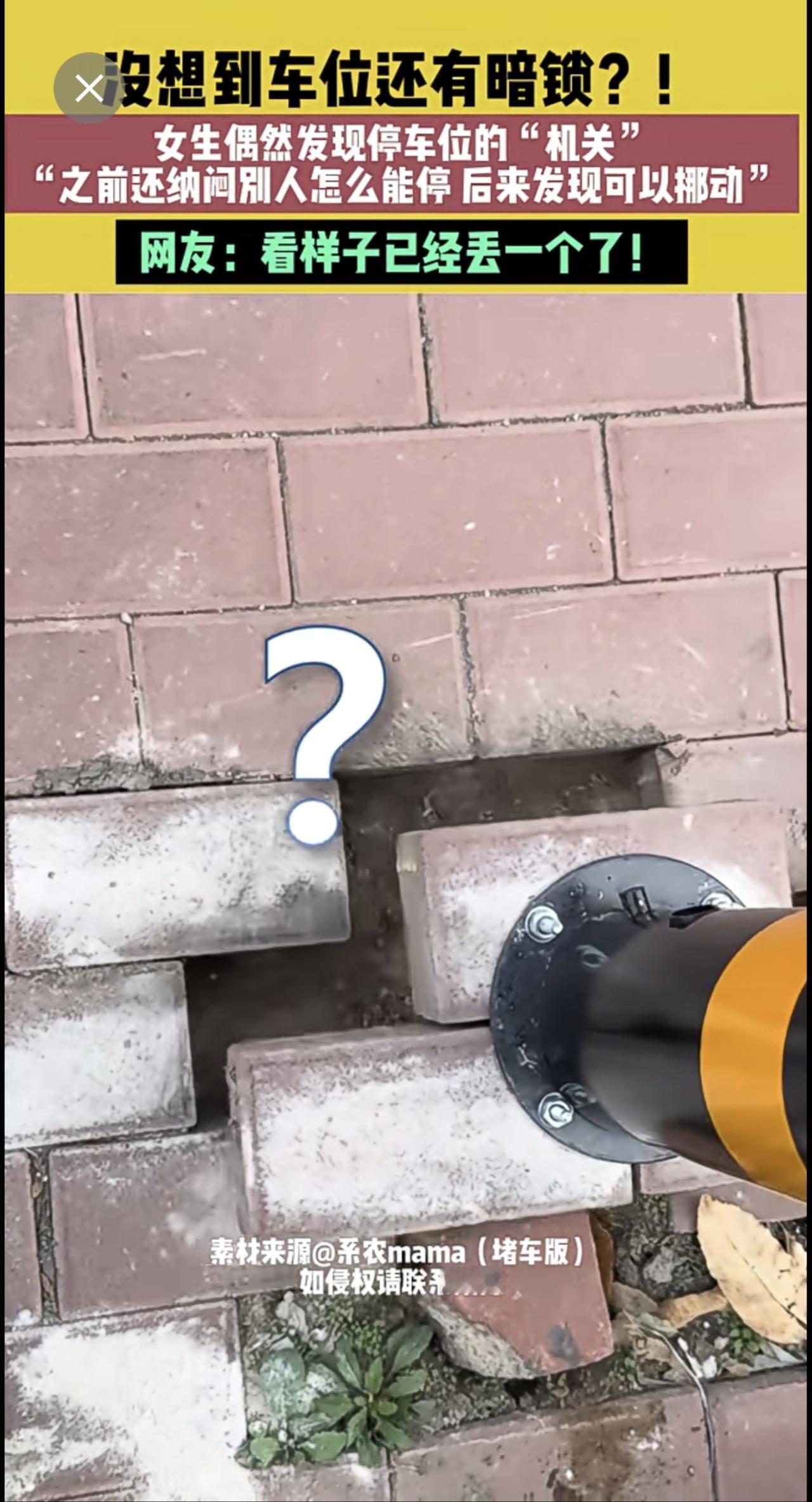 1月6日(发布)河北,没想到车位还有暗锁?!女生偶然发现停车位的“机关”,“之前还纳闷别人怎么能停 后来发现可以挪动”,网友:看样子已经丢一个了!