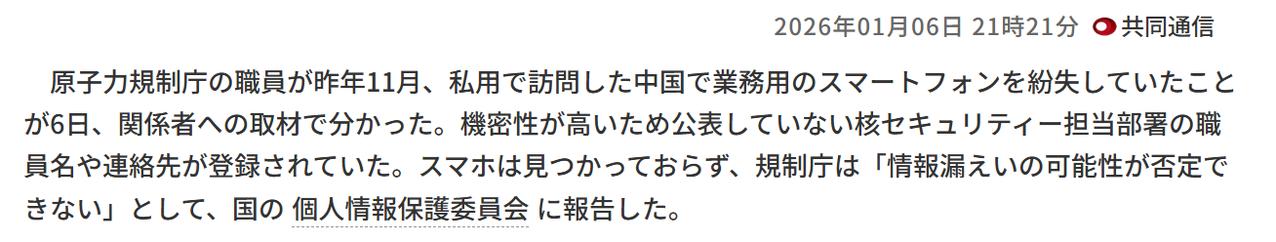 日本政府称在中国丢失机密文件,涉及核设施,引起外界高度关注。 1月6日,日政府官员向共同社表示,2025年11月,一名日本原子能监管局职员意思因私赴中国期间,在接受机场安检时,丢失一部带有政府机密信息的工作手机。 日方表示,该手机中留有日本核安全部门人员姓名与联系方式,以及相关资料,事发3天后该职员才发现大事不妙,由于手机关机无法接收信号,导致想远程删除与锁定都无法进行,最终紧急上报日本政府备案。 值得一提的是,这并非日本近年来首次丢失机密文件,2023年东京电力就曾发生员工将机密文件放在车顶后遗忘,驾车离开导致文件丢失的情况。 实际上,日本政府职员因私赴华,还携带有机密信息手机,本身就是日方自身原因,然而提及过中国边境安检可能导致遗失,目的导向性明显不纯,意在推卸自身职员与监管部门责任而已。