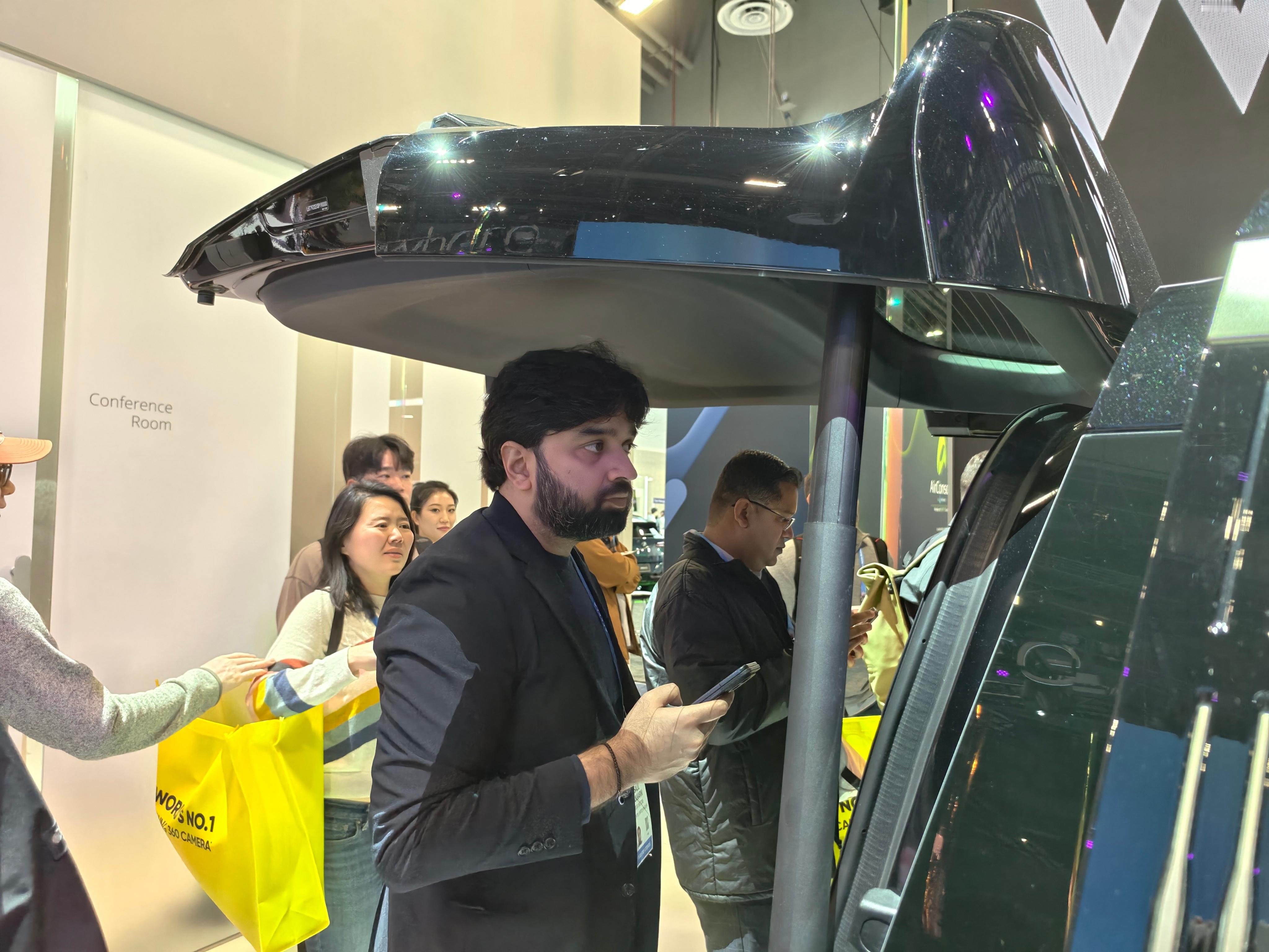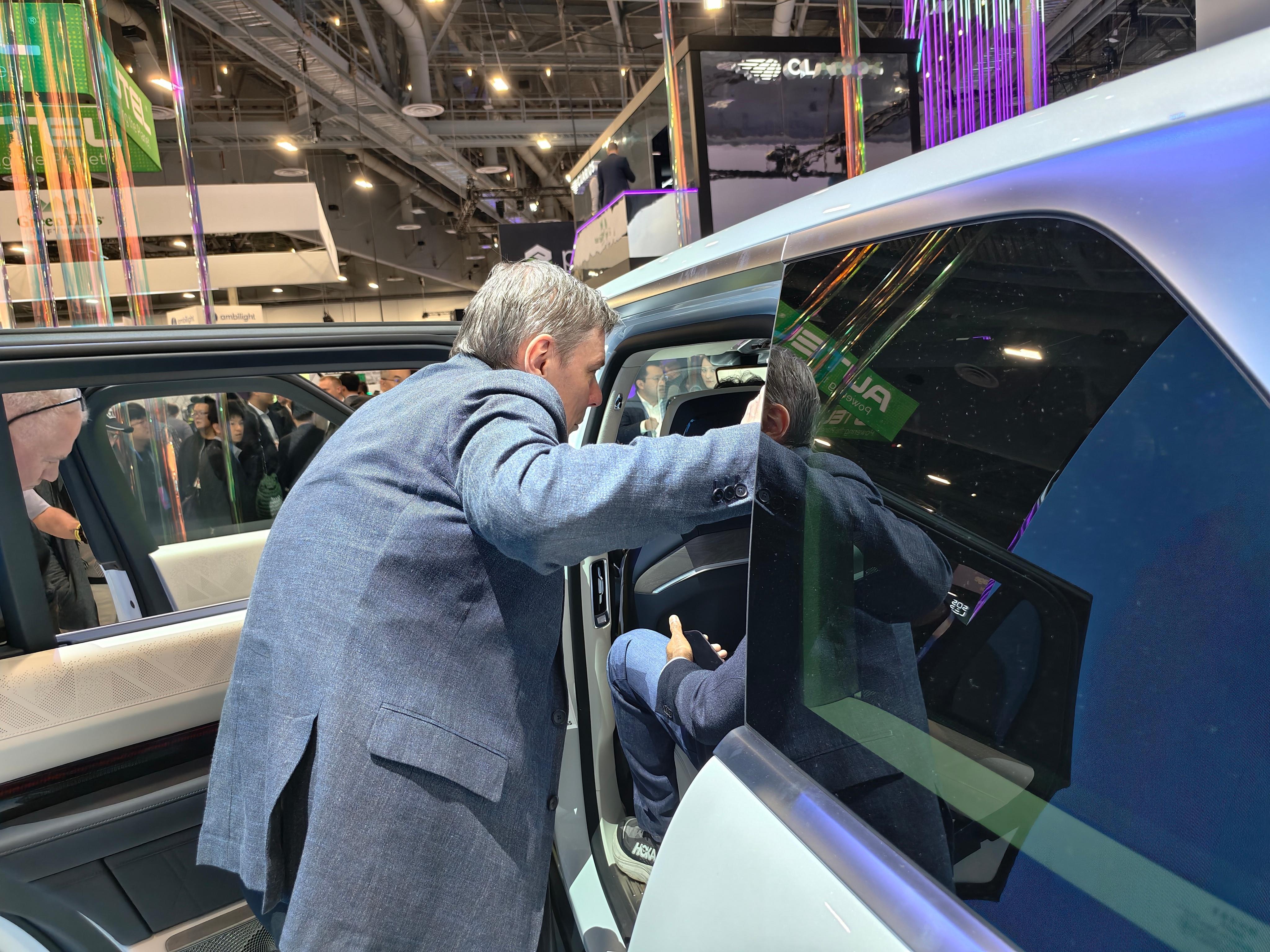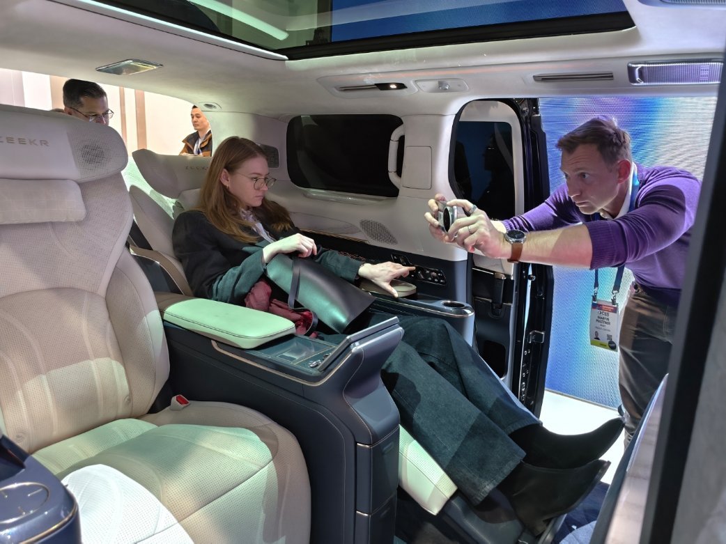 车上的老外在拍极氪 9X 和 009 光辉,车下的我在拍老外。他们为啥对这俩车这么感兴趣,突然想到一旦离开中国这个炼狱,身处 CES 这片土地上,这俩车的诸多技术、配置都是非常鹤立鸡群的。两个超豪华定位的产品,又有很强的智能化和新能源化的诠释,中国以外的市场确实不多。