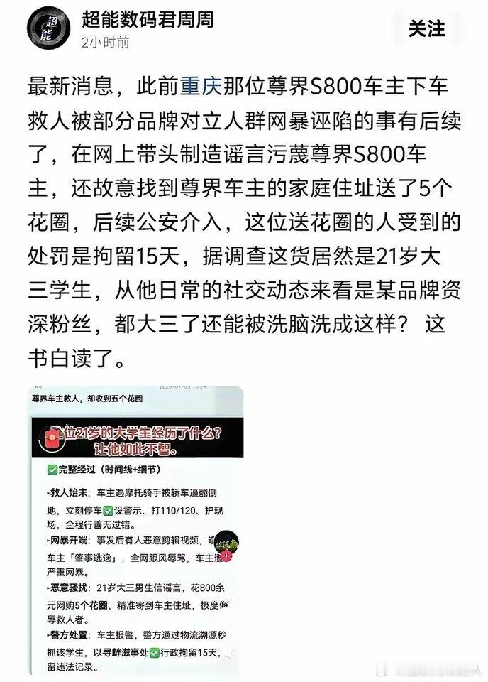 尊界S800车主做好事,结果被21岁大学生送花圈!听说还是某家的极端粉丝实在搞不懂现在的大学生脑子里在盘算什么,居然会给做好人好事的车主送花圈。听说买花圈花了800块,看来这大学生经济条件也不差啊!可惜天网恢恢疏而不漏,车主一报警,这21岁大学生就被火速抓获,拘留15天还留下案底,就因为一时冲动,前程全毁了。还是奉劝一些大学生,现在的首要任务是好好学习知识,对于社会的舆论不要听之信之,不能因为所谓的宣传信仰就没了理智,得时刻保持自己的判断力。