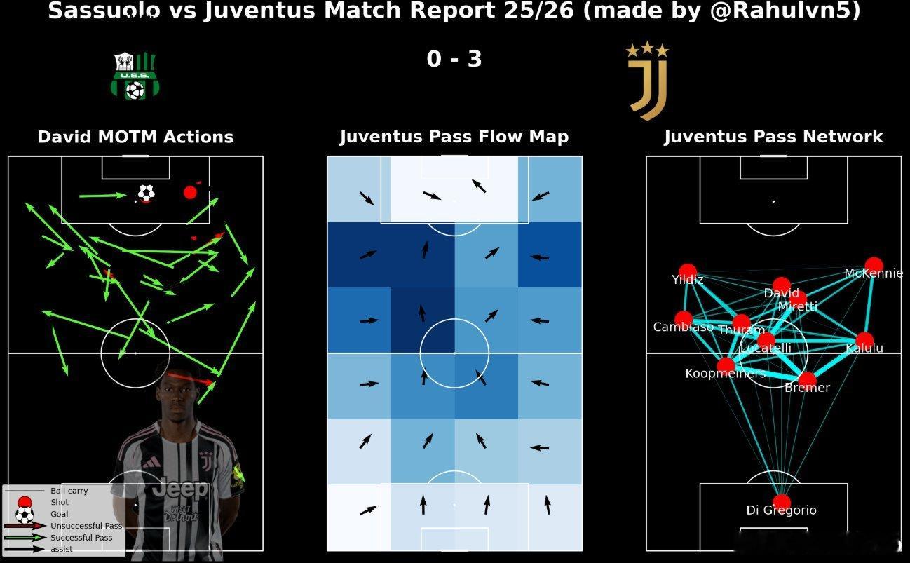 从传球路线可以清晰地看出,小小图拉姆、戴维、坎比亚索和库普梅纳斯坐镇的左边路和中路的衔接发挥了关键作用。很高兴看到戴维和米雷蒂都拿出了出色的发挥,两人还为球队贡献了两个进球。尤文图斯踢出名堂萨索洛0比3尤文图斯