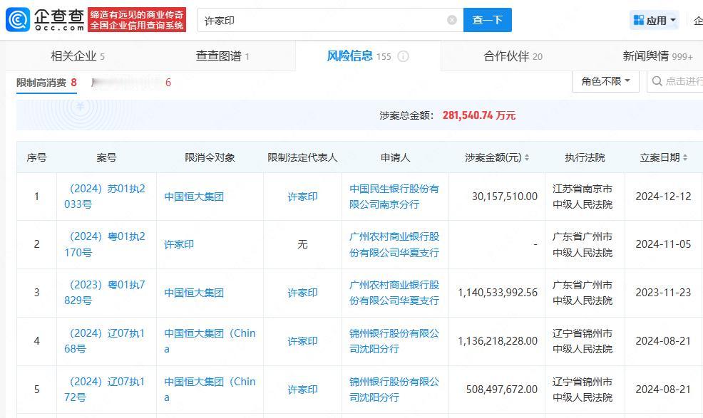 【许家印被执行4700万】 许家印被执行总金额超30亿企查查APP显示,近日,许家印新增一则被执行人信息,执行标的4700万元人民币,执行法院为北京金融法院。目前,许家印被执行总金额超30亿,关联多起限制消费案件。 此外,北京金融法院另对恒大地产集团有限公司强制执行,执行标的约41.75亿元人民币。