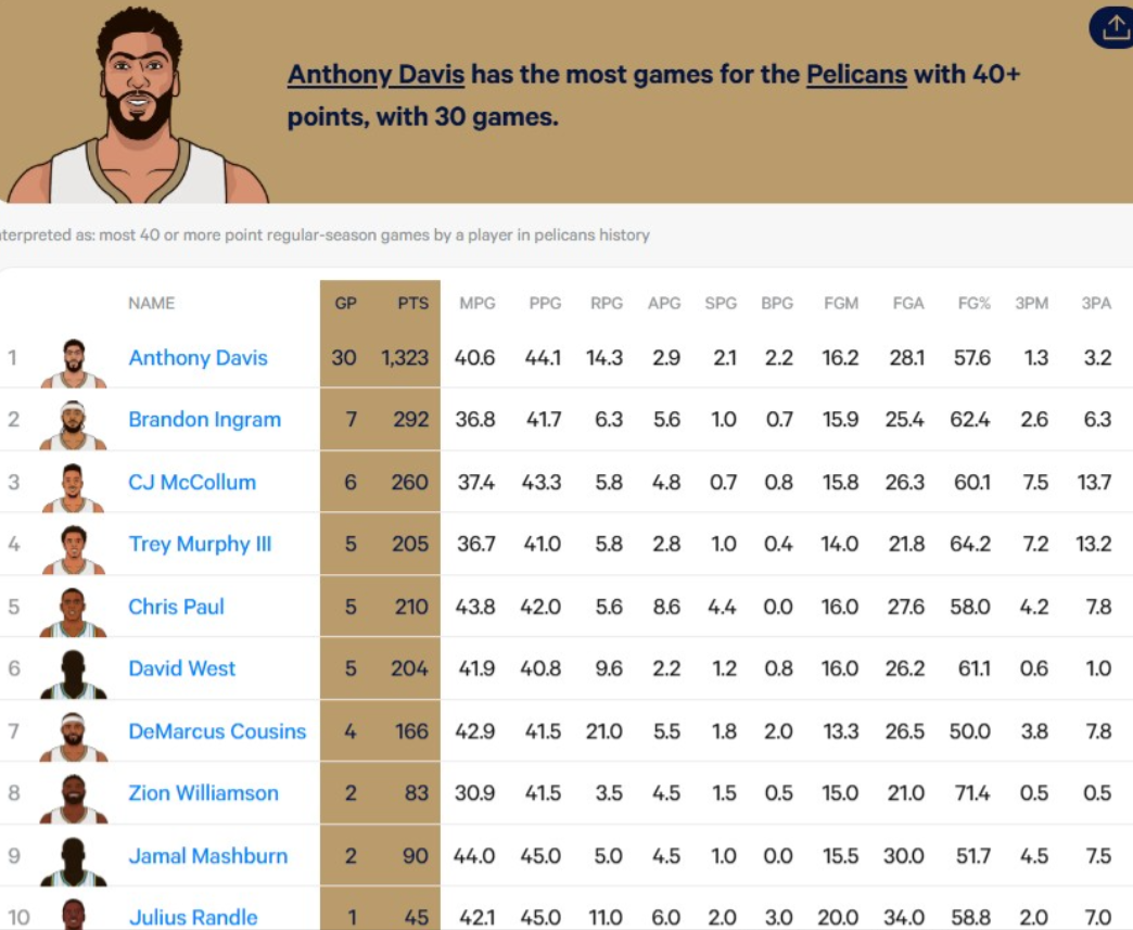 在NBA常规赛中,新奥尔良鹈鹕队在主场以103-111不敌洛杉矶湖人队,遭遇八连败。 本场比赛,鹈鹕队前锋特雷-墨菲三世惨进“空砍群”,他出场39分04秒,26投14中爆砍生涯新高的42分,另有5篮板3助攻入账,三分球17中6,罚球9中8,没有出现失误,正负值为-8。 目前,墨菲是鹈鹕队史上单场砍下40+得分次数最多的非全明星球员,同时他以5次40+的表现位居鹈鹕40+得分榜的第四位。