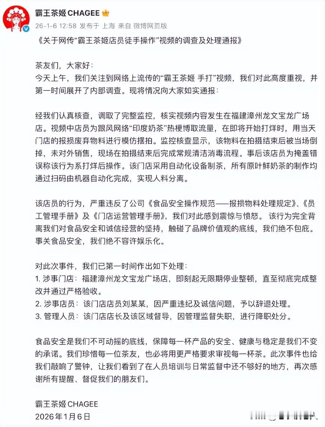 “手打奶茶”博眼球,员工被辞退,媒体:被辞不冤 据报道,近日,一则全国知名品牌霸王茶姬,店员徒手搅拌奶茶的视频,在互联网上大量传播,成为热门话题,成为互联网热搜,社会反应十分强烈。 视频中,该店员为模仿“印度奶茶”的网络热梗,不知道该店员的手是否是干净卫生和安全的,在门店内徒手操作,无论是报损物料还是供给消费者饮用的物料,都不应该有此番操作,都不应该公之于众。所以,引发了广泛质疑。 人们怀疑,该店是不是把这样的奶茶,冠以正品卖给消费者?食品卫生安全无小事!这样的奶茶,消费者敢买吗?敢喝吗?健康吗?安全吗? 据报道,事情发生以后,霸王茶姬总部,通报了该店员此番操作的详细调查结果,确认该行为完全是属于一种摆拍,并且没有影响实际销售。 试问,这样的品牌店,在工作时间,员工都能够“摆拍”?是领导授意,还是员工自发的,都是不应该的,说明该店管理松懈,不严格,不规范。 有很多消费者认为,该店总部调查可信度不高,存在有为该店行业利益,遮掩或隐瞒事实真相的嫌疑,不是第三方调查。 但是,此事件本身却如一石激起千层浪,再次将食品安全、行业管理、网络娱乐文化、消费者的利益之间的冲突,置于公众视野焦点,另人深思,将会影响整个社会,造成深远的社会效果。 霸王茶姬店的这次事件,从表面上来看,是员工一时的个人糊涂,没有深刻认识到事情的后果如此严重,是个人行为的错误实例,是很难说服大众的,说服消费者的。 此事其实则折射出短视频时代,人们一种令人担忧的为追逐流量的倾向,导致该店道德规范、职业操守、卫生职责、健康标准、安全规范与消费者权益,统统被他们轻易地抛诸脑后。 从而反映出该店和行业的管理,存在非常大的疏忽和漏洞,必然会导致降低服务质量,降低商品的品质,都存在非常大的可能性,是让消费者真正担心和害怕的事情。 此类事情必须交给官方来处理,必须交给第三方来彻查,必须以法律法规为准绳,做为消费者的保障,来切切实实维护消费者的消费权益。 至于该店停业整顿和相关人员处理,都不重要,都是“治标”,离解决实质性问题,相差甚远,以本人之见,这种餐饮店必须停业,必须整顿,必须用法律的手段严惩不贷,追究其法律责任,只有建立在以食品卫生安全管理法至上,以消费者权益至上,以食品安全文化与管理体系至上,才是“治本”之法,才是倡导的公序良俗。 以上是本人观点,如有不妥,请大家在留言区中留下你宝贵的意见,并积极参与讨论。