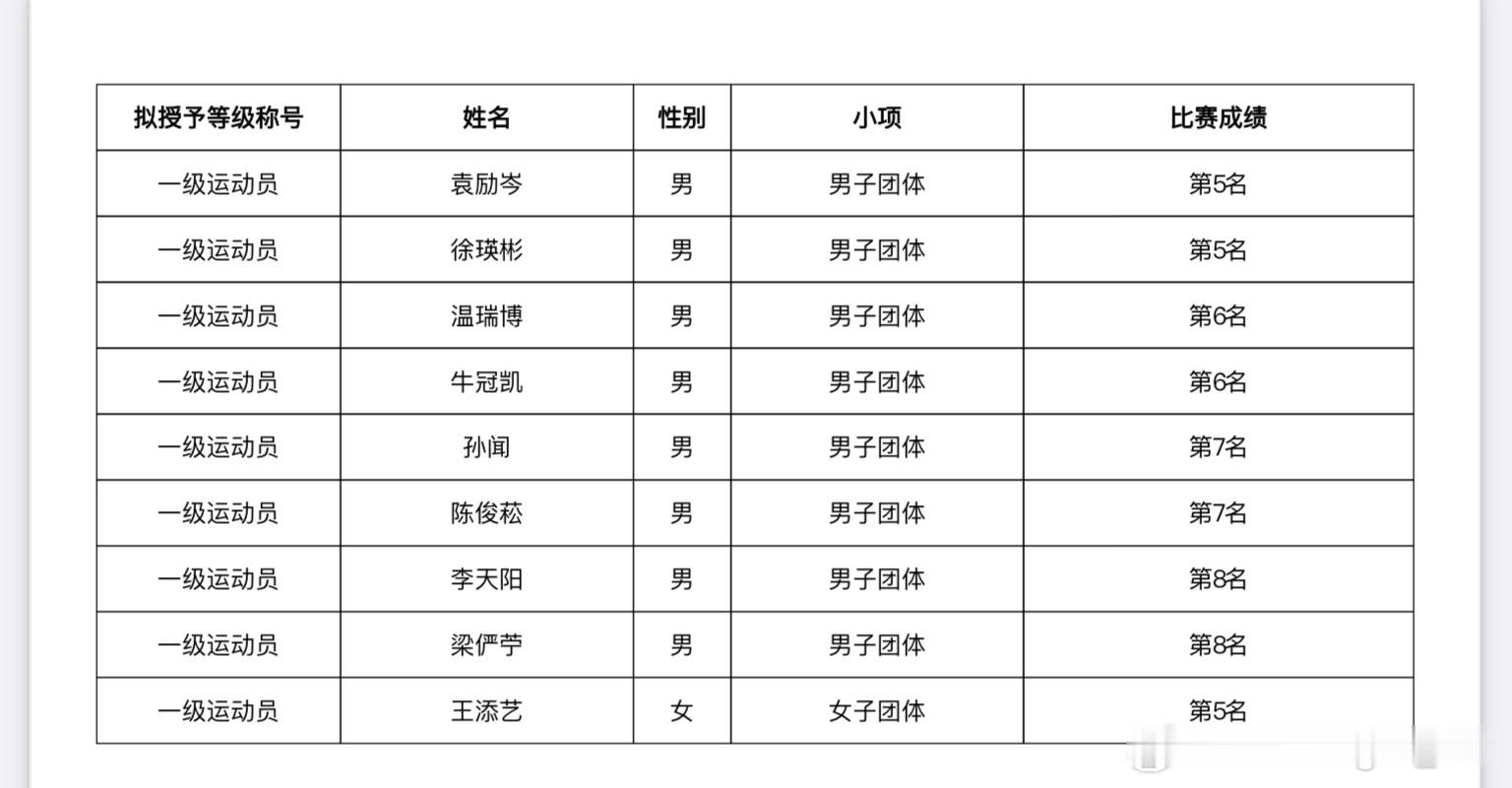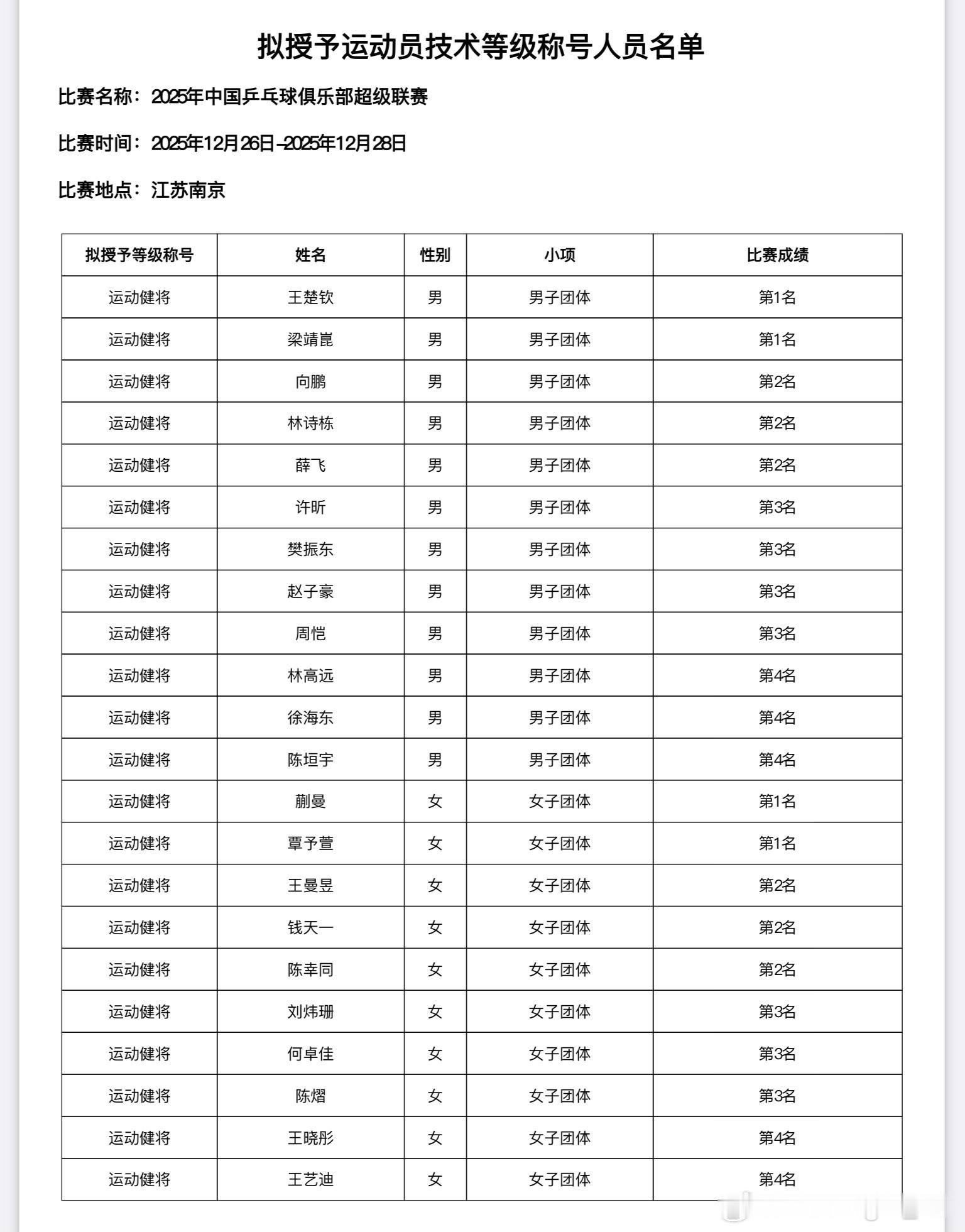 中国乒乓球协会关于公示2025年中国乒乓球俱乐部超级联赛比赛拟授予运动员技术等级称号人员名单