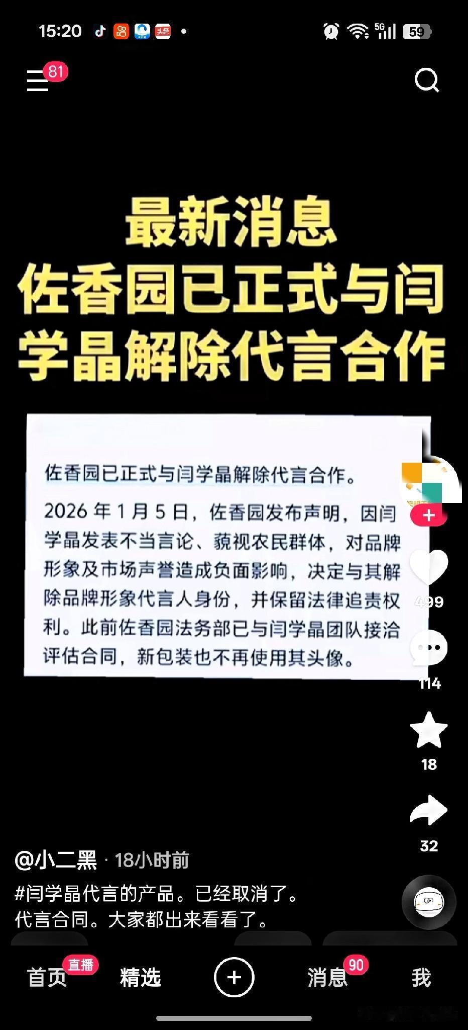 最新消息!因闫学晶的不正当言论,佐香园已正式解除余闫学晶的代言合作。不要觉得自己有点名气,说话就毫无底线。你来源于底层,名气来源于人民。脱离群众就是自毁前程。她的“凡尔赛式哭穷”让众多网友的忍耐一度达到极致,她的粉丝量在一周内下降9万。对待这样的演员,您有什么评论?欢迎留言。