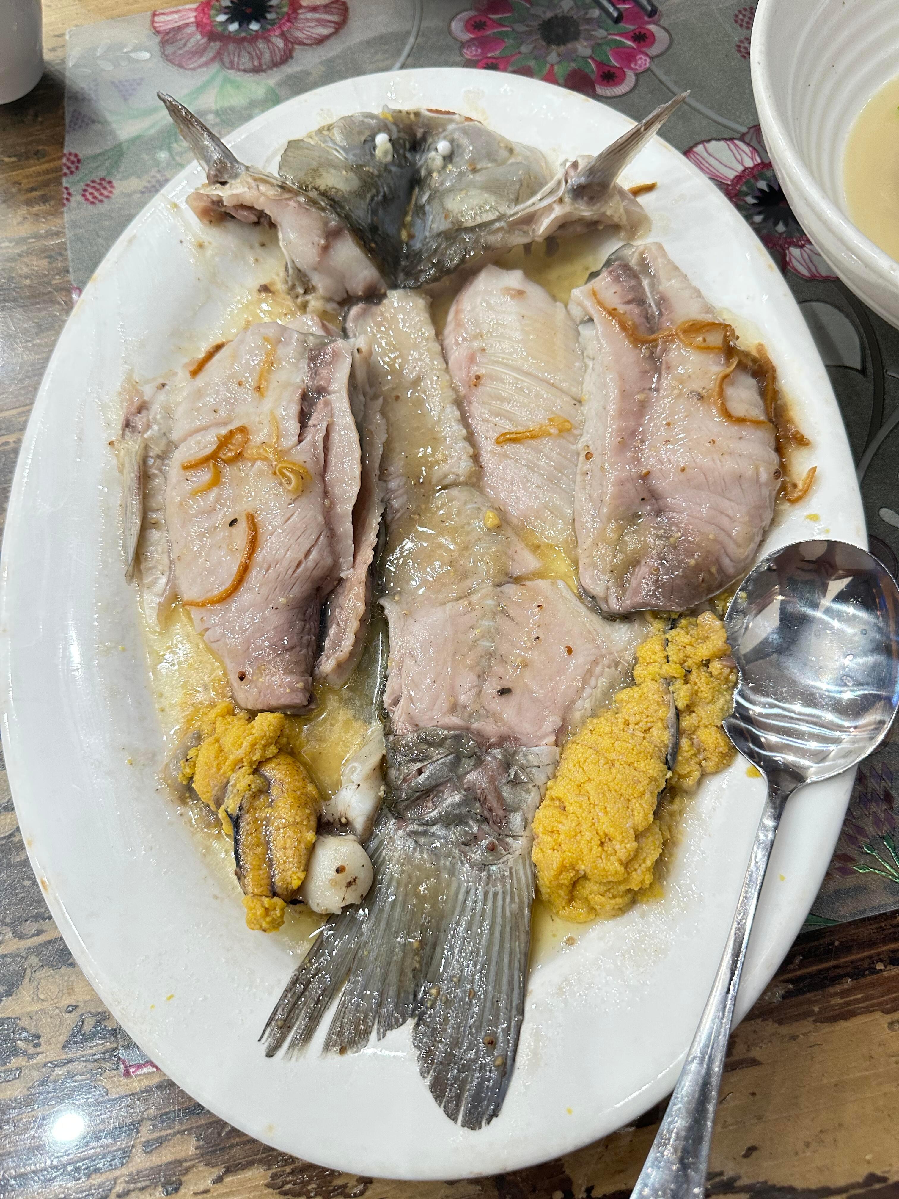 这猪腰汤也太顶了,处理得贼干净,冷了都没一点骚味,估摸着是用糖姜酒胡椒粉揉过,猪腰咬着滑嫩得很。无骨鲫鱼更是绝,完全不用吐刺,啖啖都是鲜甜的肉,吃起来很爽。我的年度美食清单