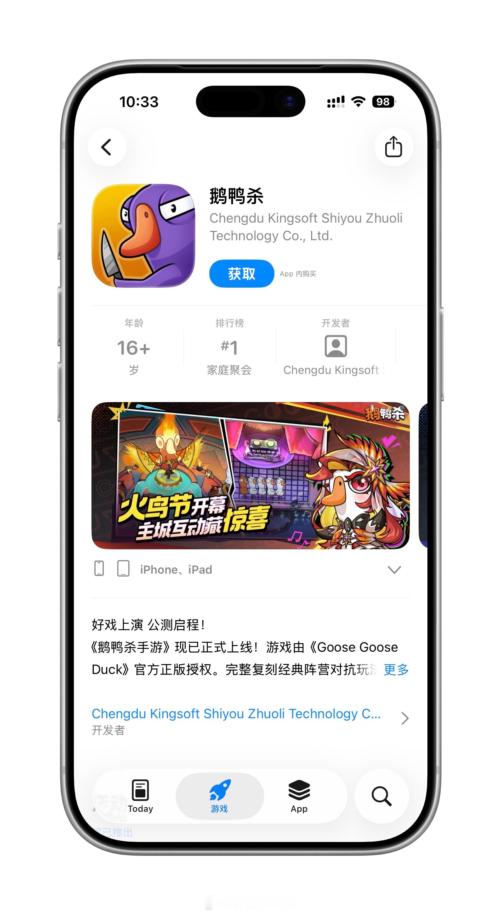 鹅鸭杀从PC端到移动端,是基本上每一个游戏的归宿…当时在steam上很火的时候我就没玩,以后大概率也不会玩,因为实在是约不到人一起玩,身边朋友都不玩这个,自己玩游戏会觉得特别无聊鹅鸭杀登顶iOS免费榜