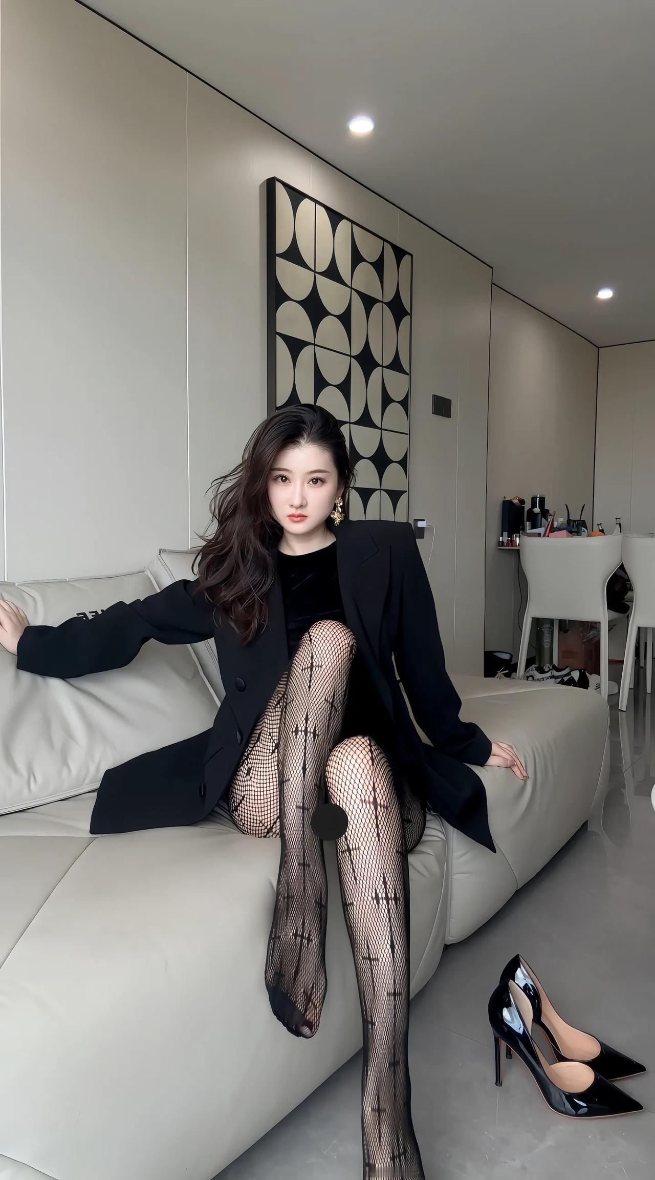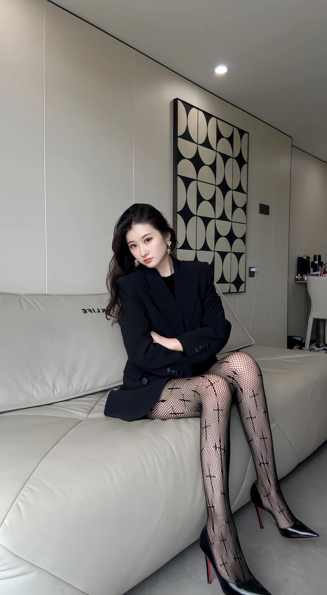 优雅黑西服,性感网袜,红底高跟鞋,都市女郎风范!